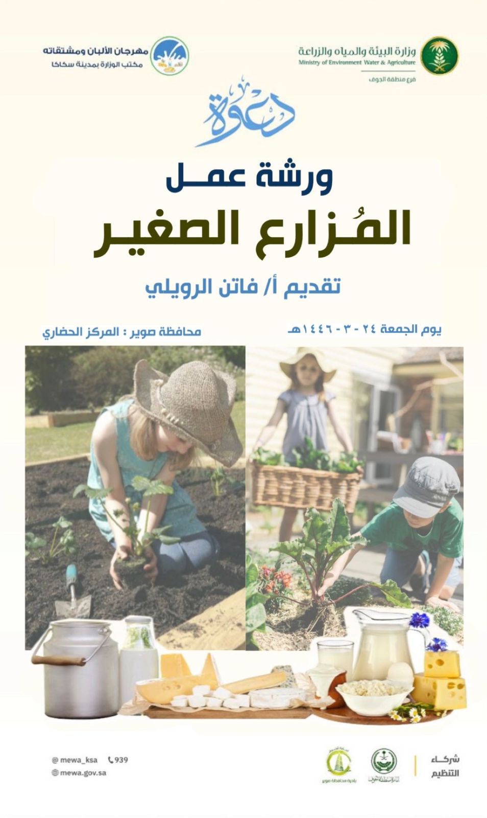 أقام فرع وزارة البيئة والمياه والزراعة في منطقة الجوف ورشة تعليمية بعنوان ( المزارع الصغير ) في مهرجان الألبان ومشتقاته المقام في محافظة صوير واستهدف فيها تعليم الأطفال أنواع النباتات وكيفية زراعتها وكيف يتم الاعتناء بها ، قدمتها المدربة : فاتن فلاح الرويلي حيث تهدف هذه الورشة الى نمو الحس البيئي والادراكي عند الأطفال واعطاء الطفل الإحساس بالمسؤولية وتعد العناية بالنباتات عند الأطفال أحد أهم الأنشطة التي تساهم في تنمية مهارات الطفل النفسية والجسدية والسلوكية إضافة إلى أن الزراعة عند الأطفال تعتبر حافز مهم لحب المسؤولية وتعزيز ثقتهم بأنفسهم