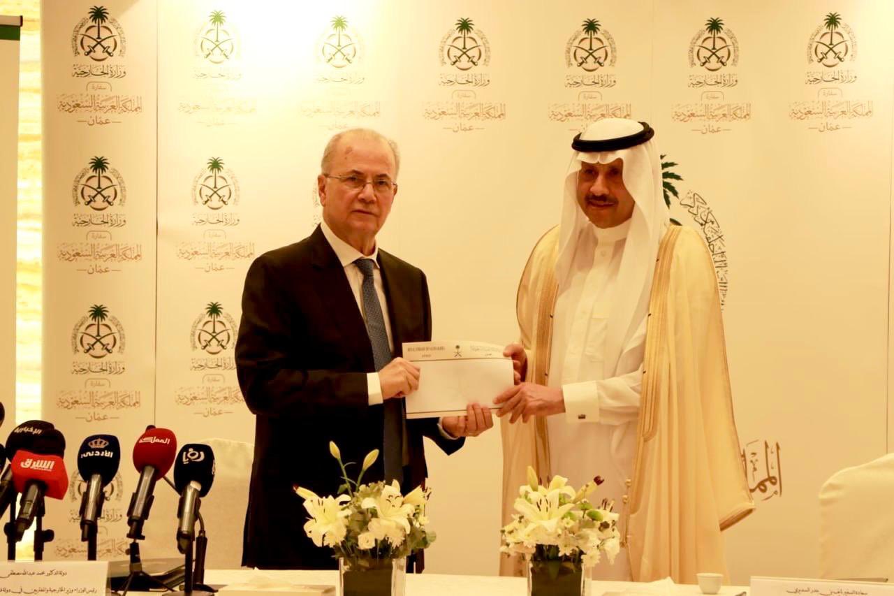 سلّم سفير خادم الحرمين الشريفين لدى الأردن غير المقيم لدى دولة فلسطين القنصل العام في القدس نايف بن بندر السديري، بمقر السفارة اليوم، رئيس وزراء دولة فلسطين الدكتور محمد مصطفى، الدعم المالي الشهري للأشقاء في فلسطين للمساهمة في معالجة الوضع الإنساني في قطاع غزة ومحيطها.