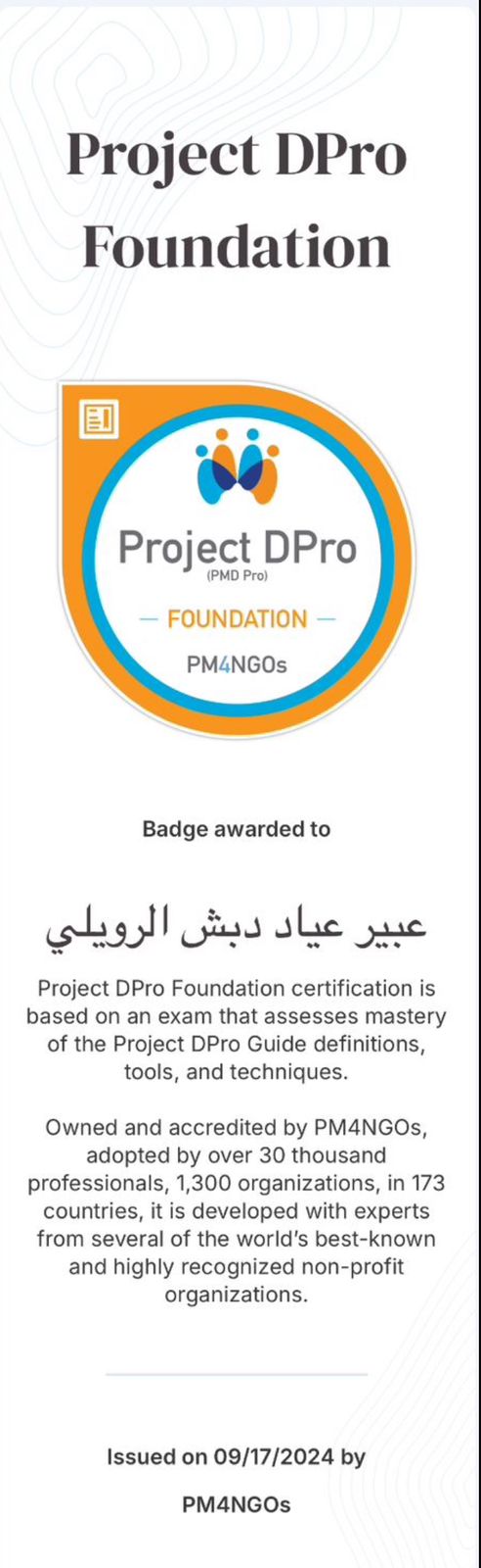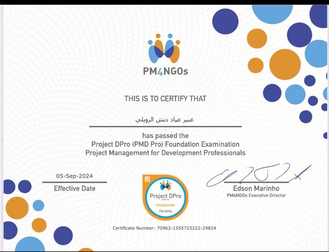 حصلت المدير التنفيذي بجمعية الخيرية بطريف الأستاذة عبير عياد الرويلي ، على شهادة مهنيه "المحترف في إدارةالمشاريع التنموية (PMD Pro)" بالإضافة للشارة الموثقة كمهنيه و كمحترفة في إدارة المشاريع التنموية