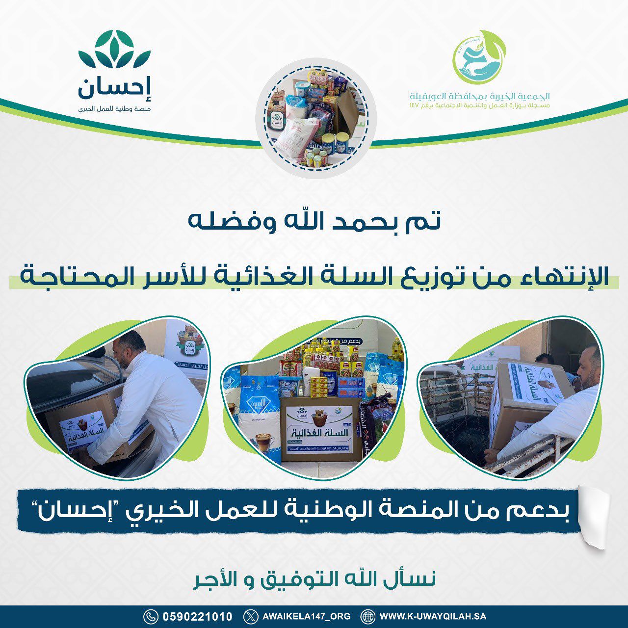 نفذت الجمعية الخيرية بالعويقيلة مشروع (السلة الغذائية للاسر المحتاجة) بدعم من منصة احسان للعمل الخيري