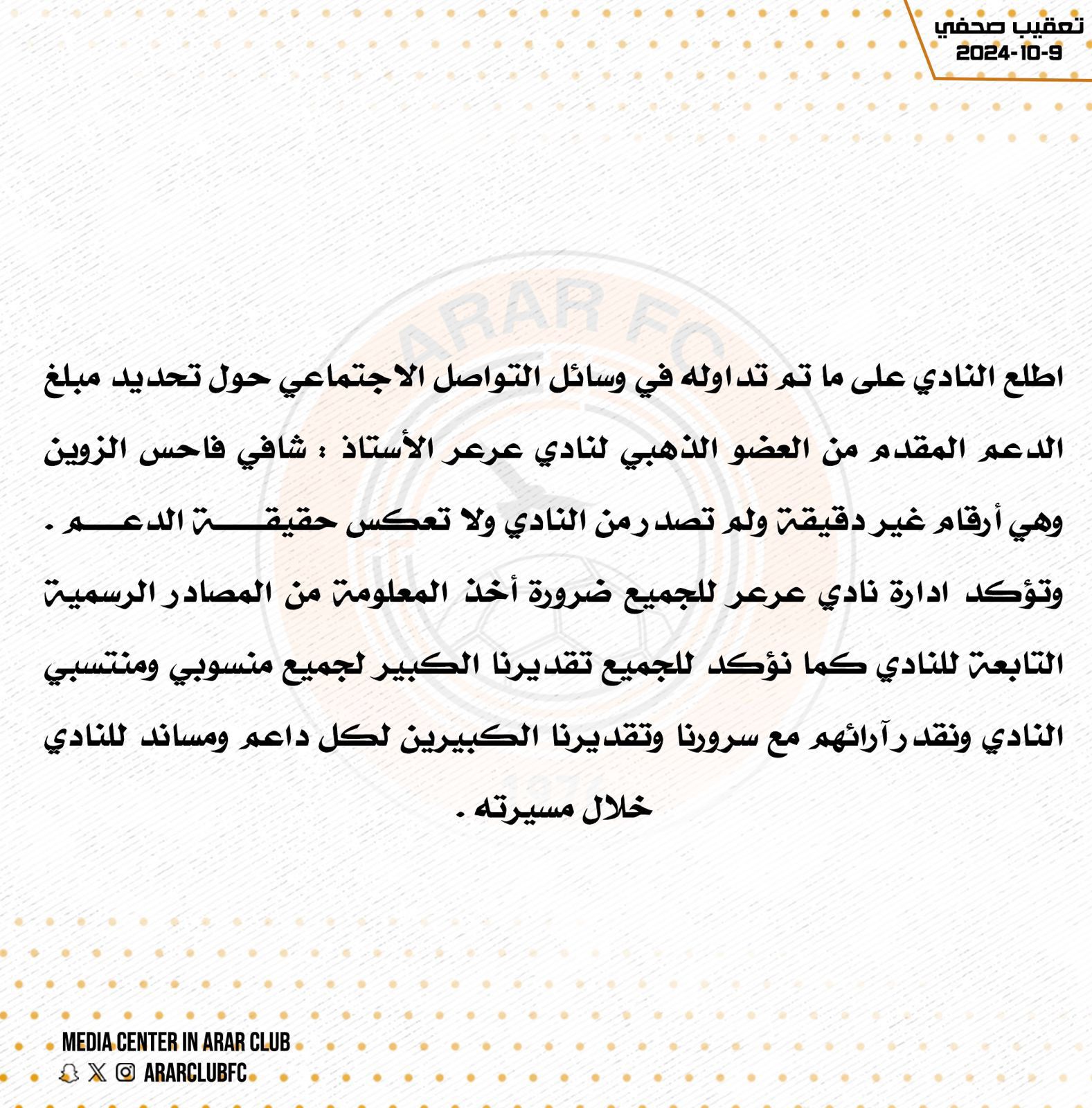 أصدر نادي عرعر عبر حسابه في منصة x بياناً إعلامياً وذلك بشأن ما يتم تداوله في وسائل التواصل الاجتماعي حول تحديد مبلغ الدعم المقدم من العضو الذهبي شافي بن فاحس الزوين .. ونؤكد على الجميع ضرورة أخذ المعلومة من مصادرها الرسمية .