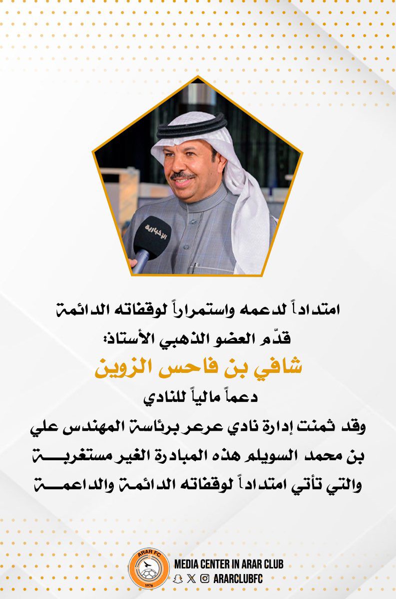 امتدادًا لدعمه واستمرارا لوقفاته الدائمة مع ناديه، قدم العضو الذهبي الأستاذ: شافي بن فاحس الزوين دعماً مالياً سخياً للنادي بعد فوز نادي عرعر على نادي اللواء بنتيجة 3 - 2 حيث احرز الأهداف لنادي عرعر محمد الصغرواي "46"فريدريك "48" ماهر بولابيار "60" ، وقد ثمنت إدارة النادي برئاسة المهندس علي بن محمد السويلم هذه المبادرة الغير مستغربة والتي تأتي امتدادًا لوقفاته الدائمة والداعمة .