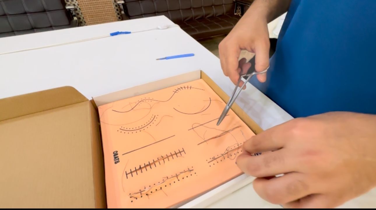 كما تحدث بشكل عملي عن طريقة الخياطة الجراحيةحيث تستهدف المحاضرة طلاب الكليات الصحية وفي نهاية المحاضرة تم تقسيم الحضور الى مجموعات وتم تطبيق عملي.