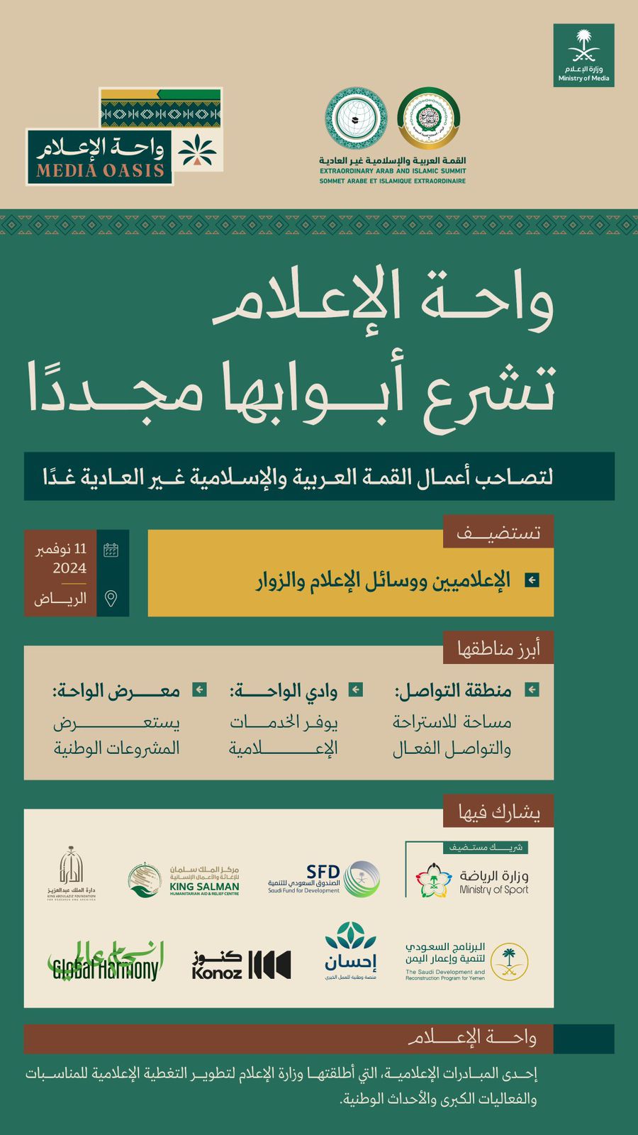 تقيم وزارة الإعلام النسخة الثامنة من "واحة الإعلام" في منطقة "الصالات الرياضية" بمدينة الرياض يوم 11 نوفمبر الجاري، تزامنًا مع انعقاد القمة العربية والإسلامية غير العادية.