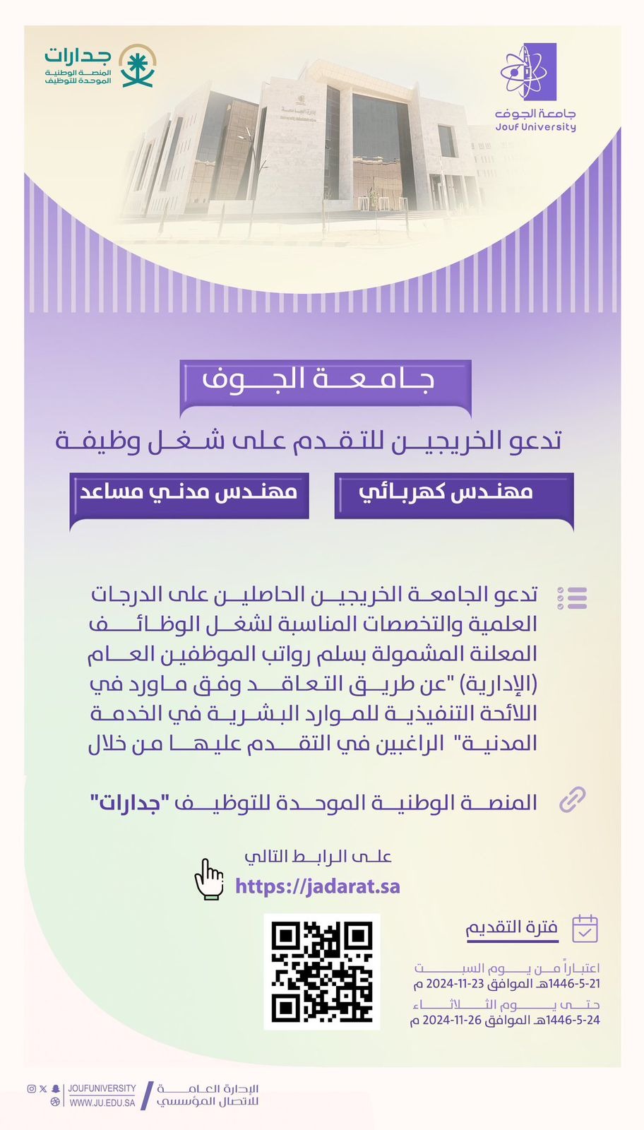 دعت جامعة الجوف الخريجين الحاصلين على الدرجات العلمية والتخصصات المناسبة إلى التقديم لشغل وظيفة ( مهندس كهربائي – مهندس مدني مساعد ) والمشمولة بسلم رواتب الموظفين العام ( الإدارية ) عن طريق التعاقد، وفق ما ورد في اللائحة التنفيذية للموارد البشرية في الخدمة المدنية. الراغبين في التقدم عليها من خلال المنصة الوطنية الموحدة للتوظيف ”جدارات” والباركود المرفق.