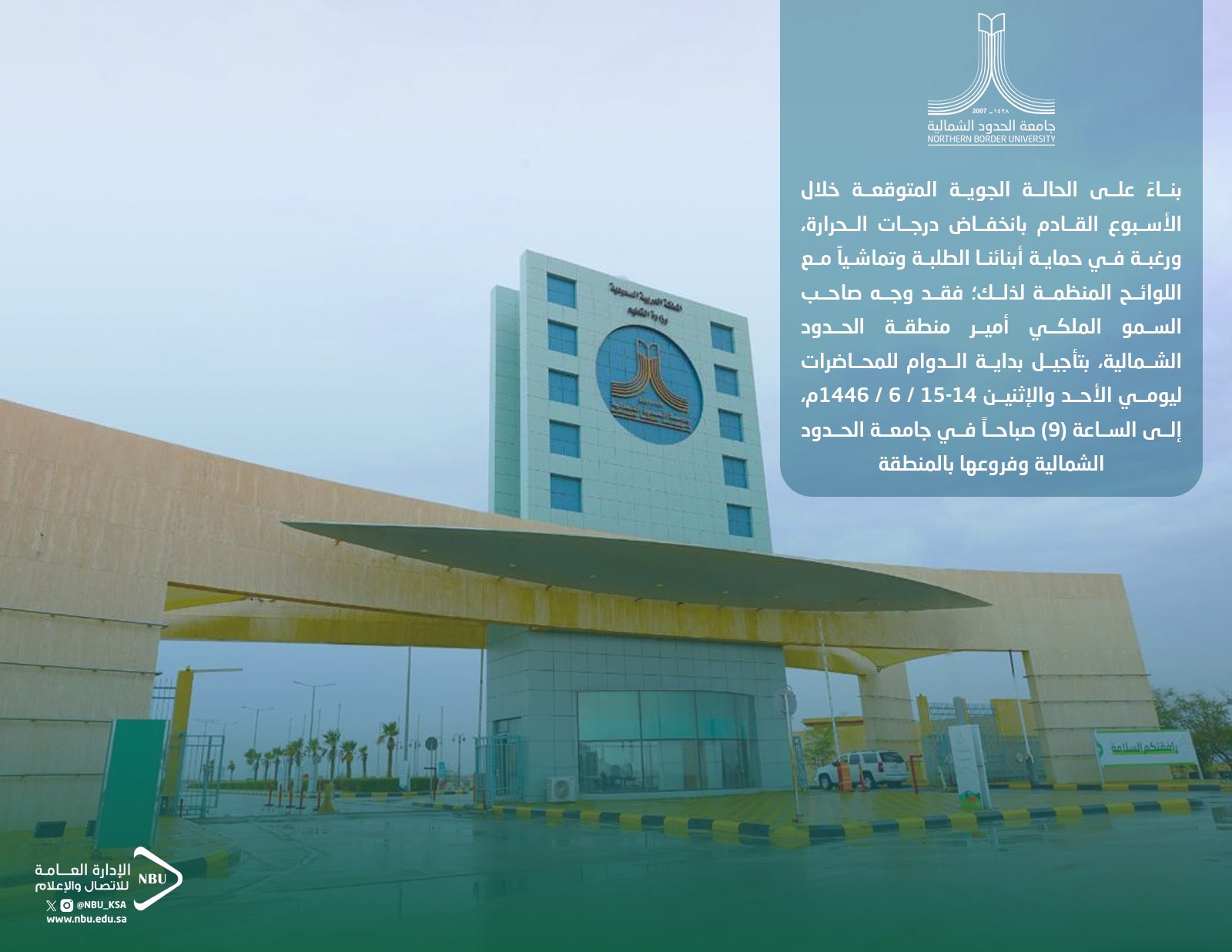بناءً على الحالة الجوية المتوقعة خلال الأسبوع القادم بانخفاض درجات الحرارة، ورغبة في حماية أبنائنا الطلبة وتماشياً مع اللوائح المنظمة لذلك؛ فقد وجه صاحب السمو الملكي أمير منطقة الحدود الشمالية، بتأجيل بداية الدوام للمحاضرات ليومي الأحد والإثنين 14-15 / 6 / 1446م، إلى الساعة (9) صباحاً في جامعة الحدود الشمالية وفروعها بالمنطقة.