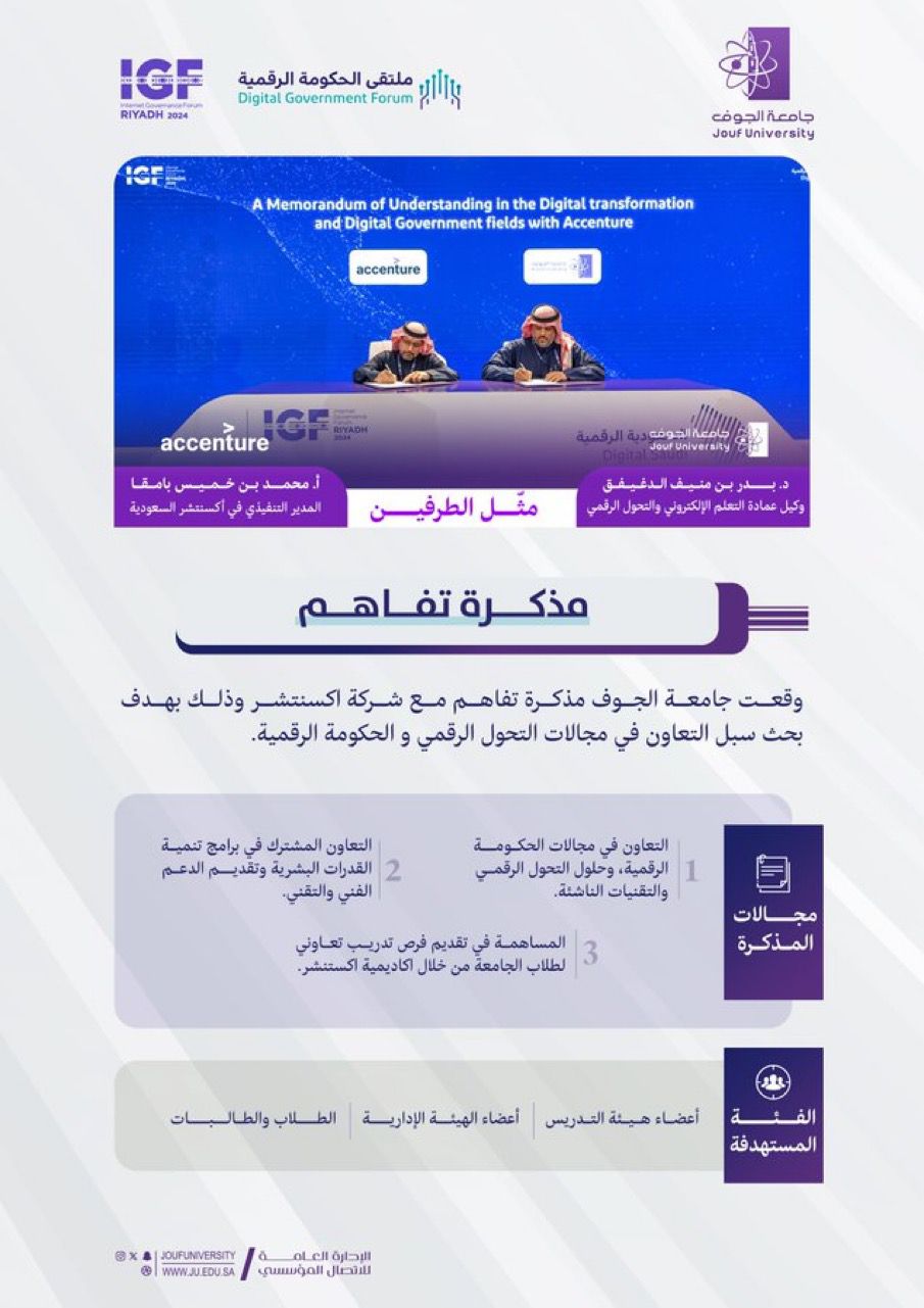 وقعت جامعة الجوف وشركة اكسنتشر مذكرة تفاهم، وتهدف إلى بحث سبل التعاون في مجالات التحول الرقمي والحكومة الرقمية، والتعاون المشترك في برامج تنمية القدرات البشرية، وذلك ضمن أعمال منتدى حوكمة الإنترنت و المقام في مدينة الرياض.