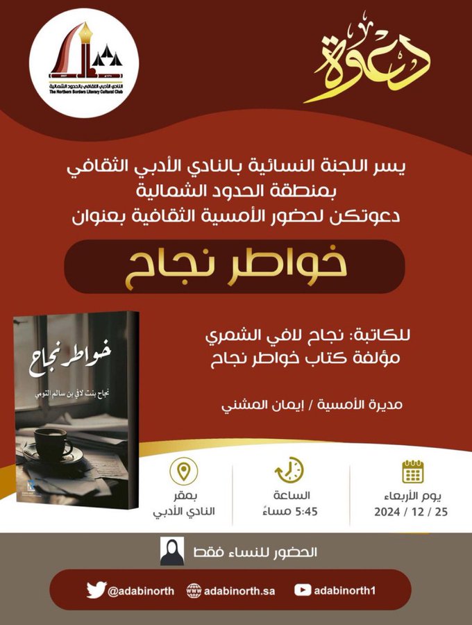 تقيم اللجنة النسائية بالنادي الأدبي الثقافي بمنطقة الحدود الشمالية ، أمسية ثقافية بعنوان: خواطر نجاح، للكاتبة: نجاح لافي الشمري ، مؤلفة كتاب خواطر نجاح