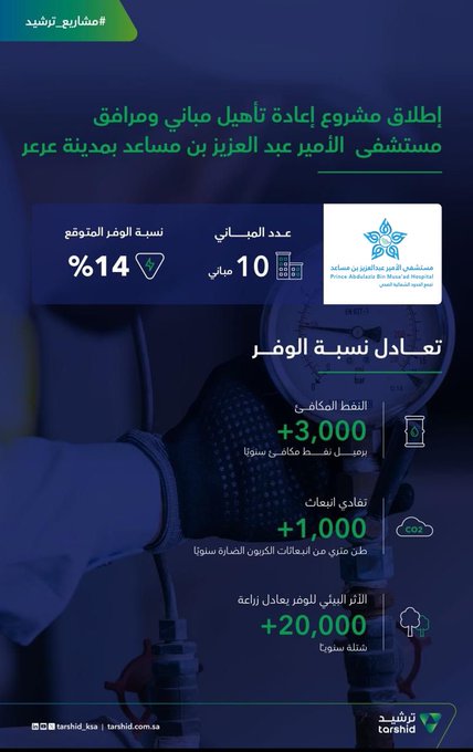 أطلقت ترشيد أعمال مشروع رفع كفاءة الطاقة في مباني ومرافق مستشفى الأمير عبد العزيز بن مساعد بمدينة عرعر، حيث يوفر مستهدف يبلغ 14% في استهلاك الطاقة .