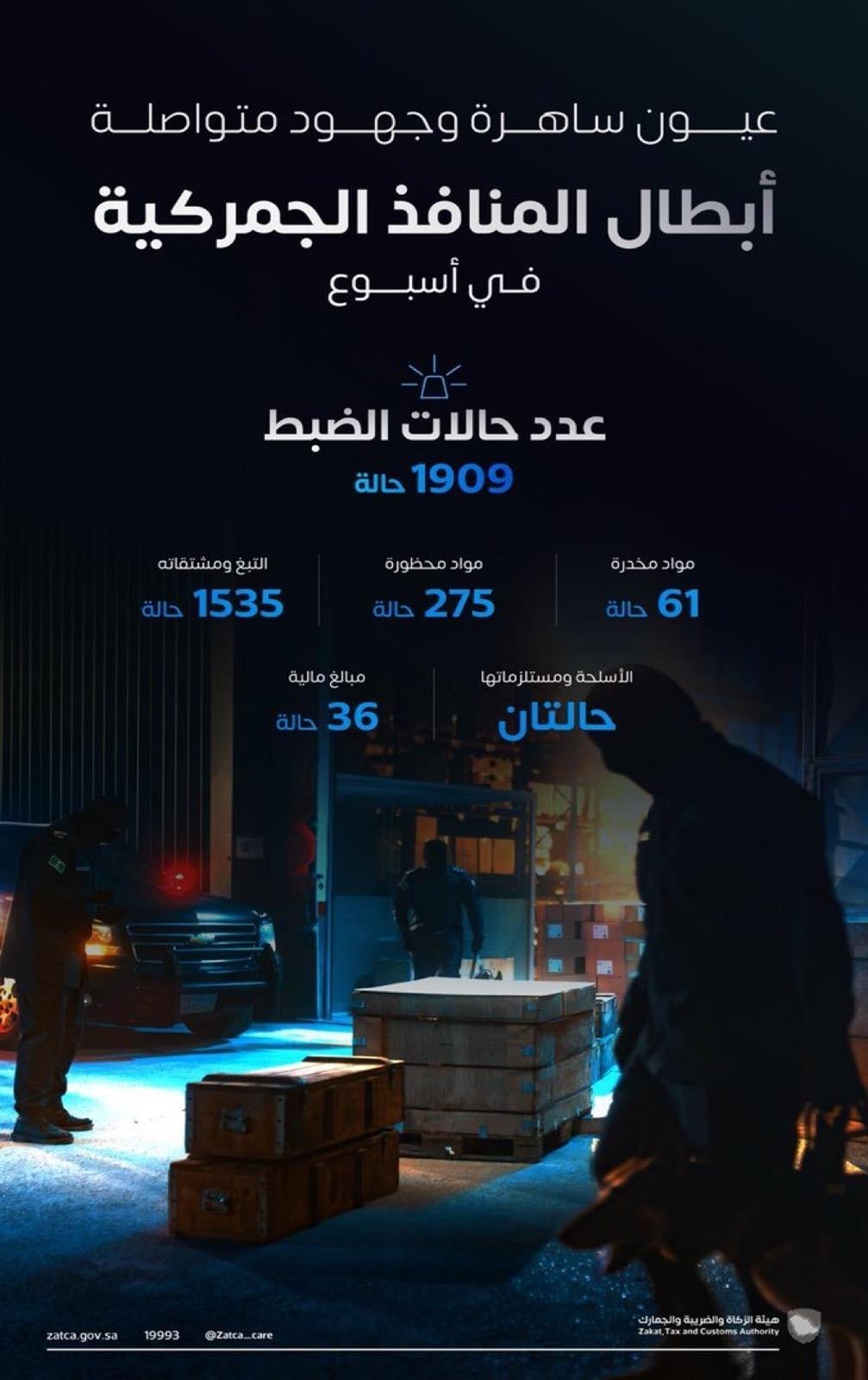 سجلت المنافذ الجمركية البرية والبحرية والجوية 1909 حالات ضبط للممنوعات، وذلك في إطار الجهود المستمرة التي تبذلها هيئة “الزكاة والضريبة والجمارك” لتعزيز الجانب الأمني وحماية المجتمع من الممنوعات بمختلف أنواعها وأشكالها.