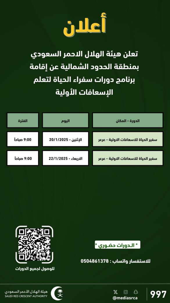 تعلن هيئة الهلال الأحمر السعودي بمنطقة الحدود الشمالية عن إقامة برنامج ودورات سفراء الحياة لتعلم الإسعافات الأولية في عرعر للأسبوع القادم وأن هذه البرامج والمحاضرات تأتي ضمن سلسلة برامج وانشطة ينفذها فرع الهيئة بالمنطقة يستهدف تدريب عامة المجتمع من مواطنين ومواطنات ومقيمين في مركز التدريب والتثقيف المجتمعي على المهارات الأساسية وتعلم الإسعافات الأولية وكيفية التعامل مع الحالات الطارئة ورفع قدرات المتدربين لمواجهتها .