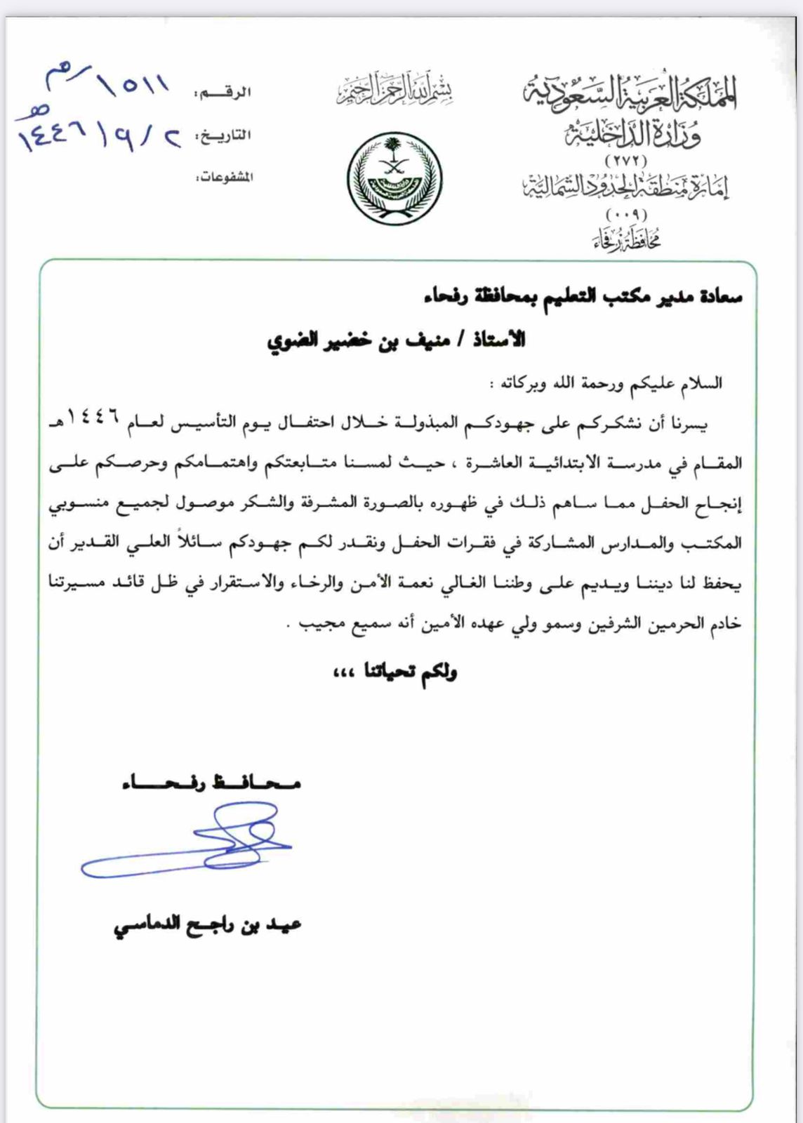 وجه محافظ رفحاء شكره وتقديره لمدير مكتب تعليم رفحاء على الجهود المبذولة في تنظيم وإنجاح الحفل الذي أقيم بمناسبة يوم التأسيس، مشيدًا بالدور الفاعل للمكتب في إبراز هذه المناسبة الوطنية بما يليق بأهميتها.