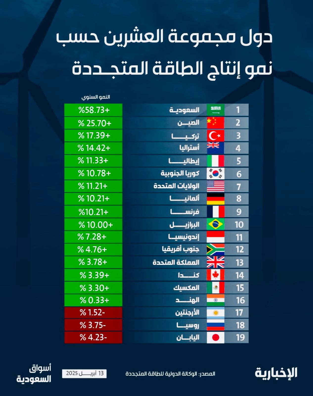 تصدرت السعودية قائمة الأكثر نموًا بين دول العشرين في إنتاج الطاقة المتجددة خلال 2024. حيث حصلت السعودية على المركز الأول بــ +58,73% ،وجاءت الصين بالمركز الثاني بــ +25,70 % ،فيما وحلت تركيا بالمركز الثالث بــ +17,39% .