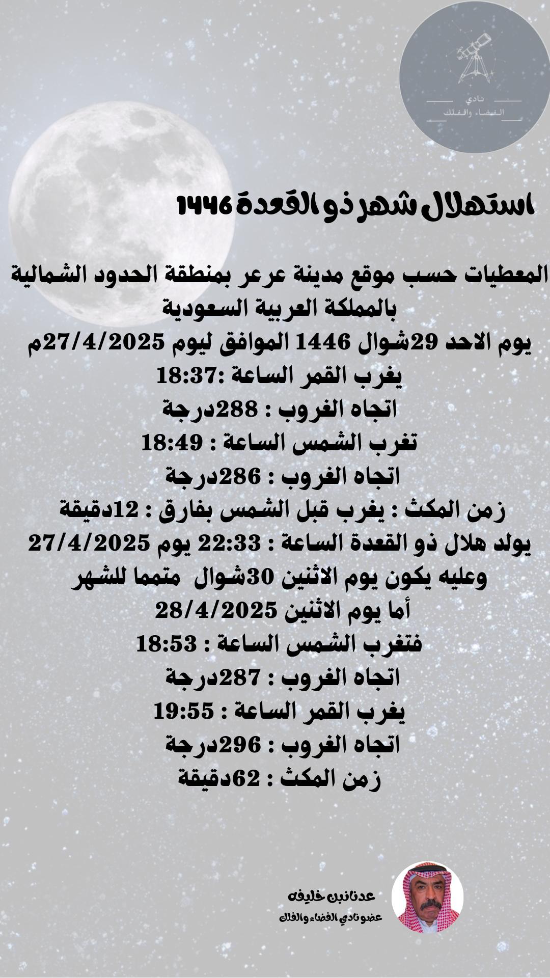 حدد عضو نادي الفضاء والفلك الاستاذ :- عدنان خليفة استهلال شهر ذو القعده باليوم والدقيقة ومتى ولادة الهلال ووقت غياب القمر