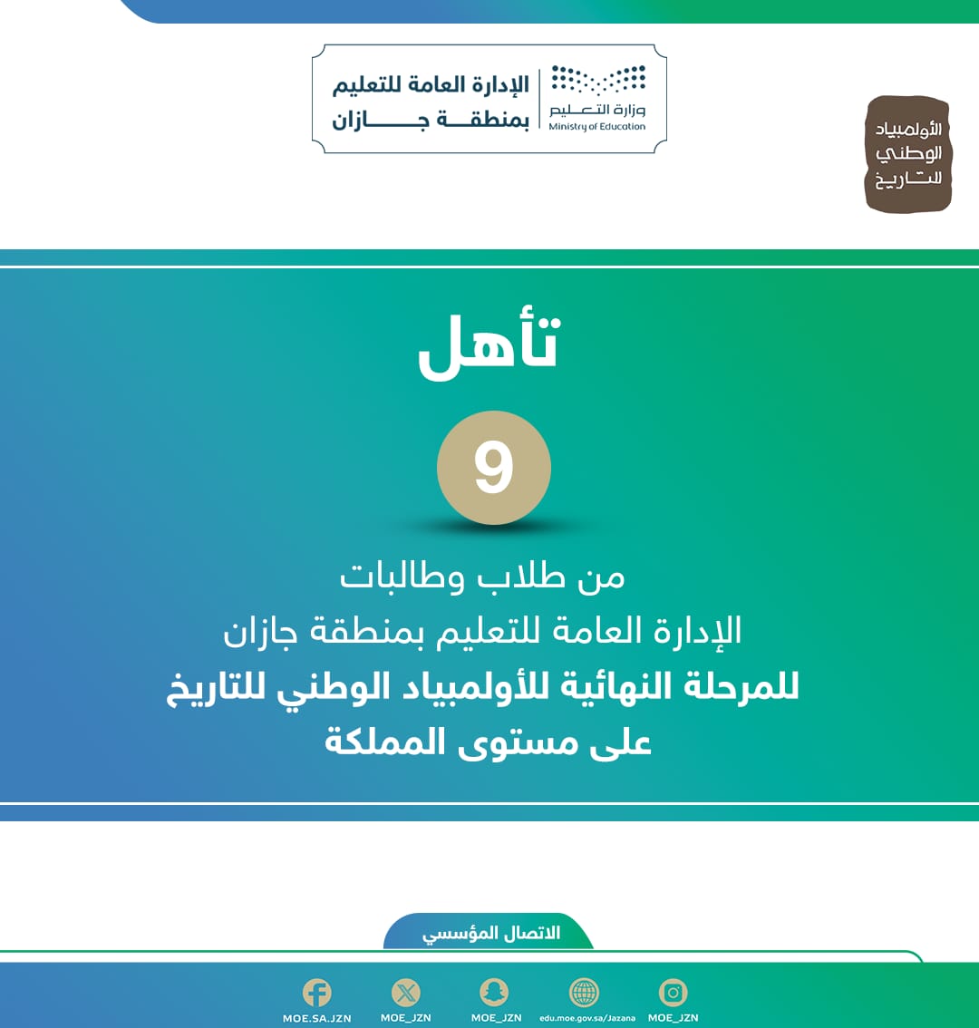 تأهل 9 من طلاب وطالبات الإدارة العامة للتعليم بمنطقة جازان للمرحلة النهائية للأولمبياد الوطني للتاريخ 2024م ، ضمن أفضل 100 طالب وطالبة على مستوى المملكة، حيث ستُقام المسابقة النهائية نهاية شهر شوال المقبل وتستضيفها الإدارة العامة للتعليم بمنطقة حائل .