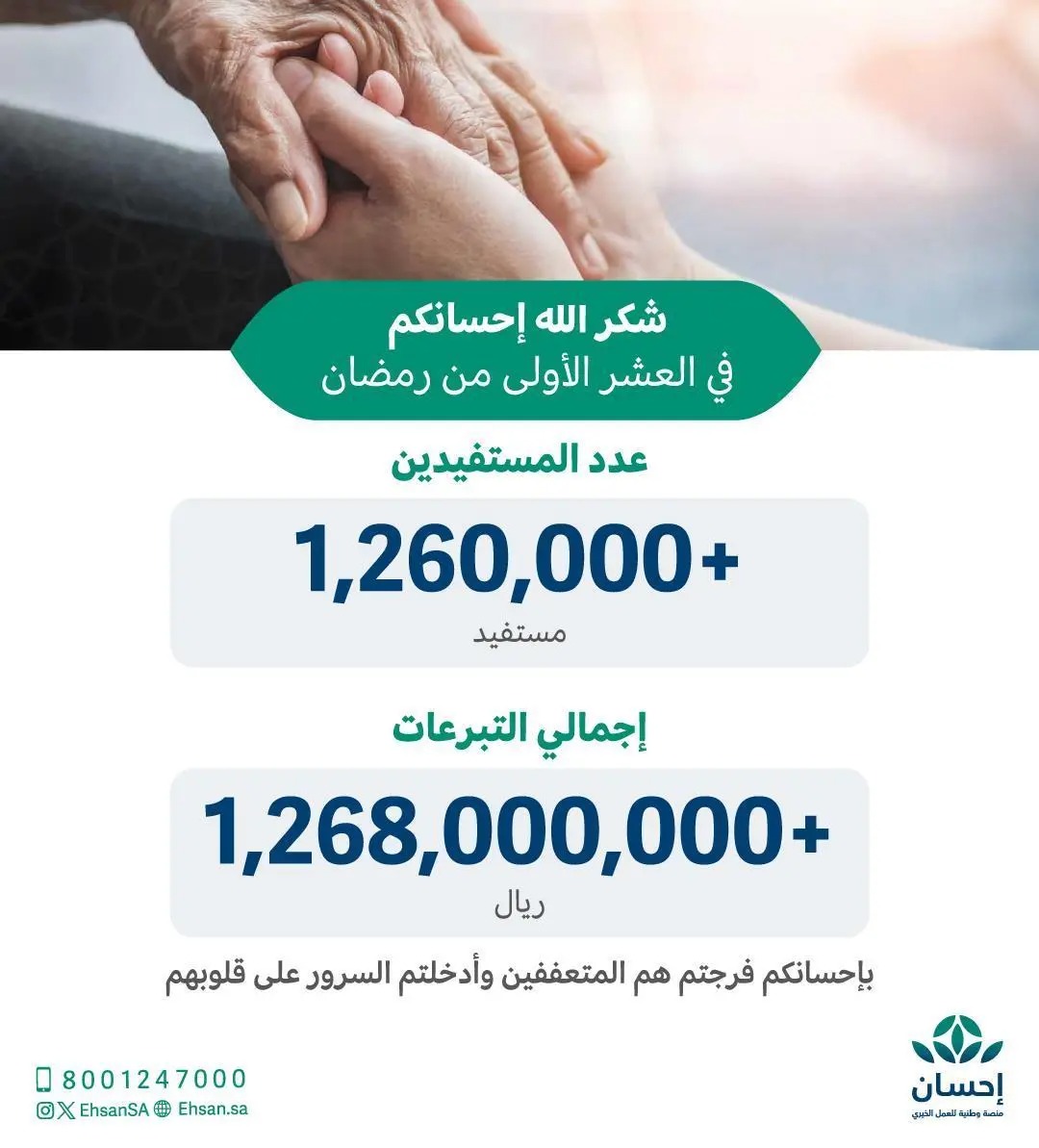 وبلغت عمليات التبرع حتى الآن 3.148.205 عمليات استفاد منها أكثر من 1.260.000 مستفيد ومستفيدة خلال الأيام العشرة الأولى من رمضان في عدة مجالات خيرية وتنموية منها: التعليمية، والاجتماعية، والصحية، والغذائية، والسكنية، والدينية، وإعانة المعسرين، ووقف الإحسان.