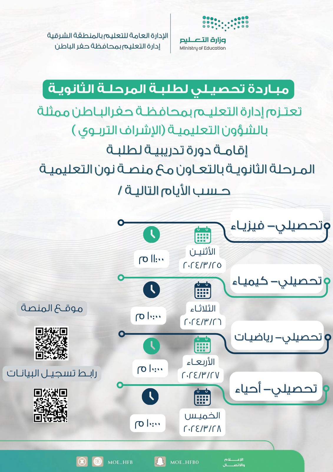 ضمن خطة تعليم حفر الباطن في تحسين نواتج التعلم، ينفذ الإشراف التربوي في التعليم حفر الباطن مبادرة تحصيلي، والتي تستهدف طلاب وطالبات المرحلة الثانوية بالتعاون مع منصة نون التعليمية، لبناء رحلة تعليمية متكاملة تسهم في تنمية وتطوير قدرات الكوادر التعليمية، يستهدف البرنامج المواد ( الفيزياء، الكيمياء، الرياضيات، الأحياء ).