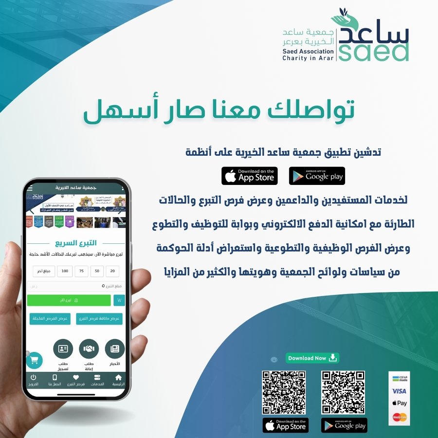 تدشين تطبيق جمعية ساعد الخيرية على نظام IOS - ونظام Android ، لخدمات المستفيدين والداعمين لفرص التبرع و الدفع الالكتروني للتبرعات والكثير من المزايا.