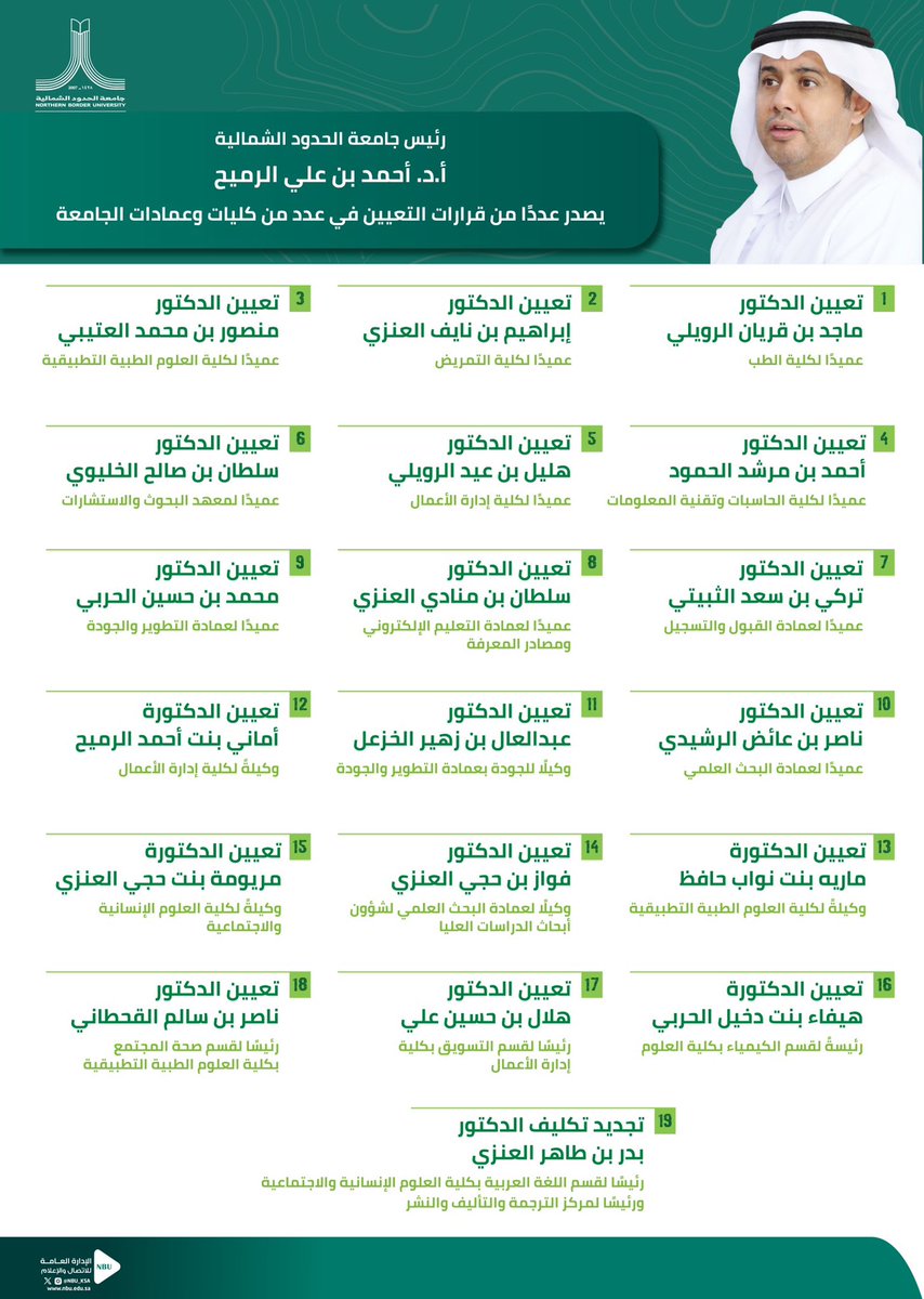 أصدر رئيس جامعة الحدود الشمالية أ.د.أحمد بن علي الرميح؛ عددًا من قرارات التعيين في عدد من كليات وعمادات الجامعة.
