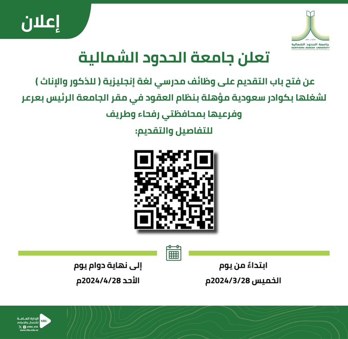 تعلن جامعة الحدود الشمالية عن فتح باب التقديم على وظائف مدرسي لغة إنجليزية (للذكور والإناث) لشغلها بكوادر سعودية مؤهلة بنظام العقود في مقر الجامعة الرئيس بعرعر وفرعيها بمحافظتي رفحاء وطريف.