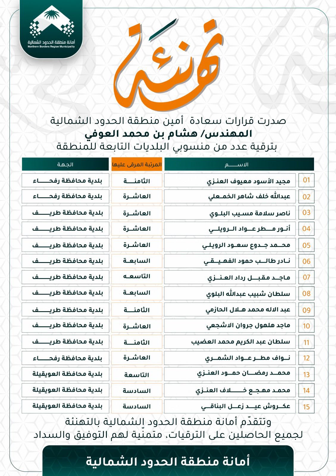 صدرت قرارات سعادة أمين منطقة الحدود الشمالية المهندس/ هشام بن محمد العوفي بترقية عدد من منسوبي البلديات التابعة للمنطقة