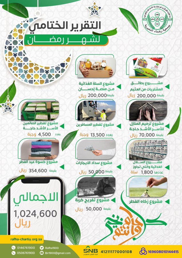 أصدرت جمعية رفحاء الخيرية التقرير الختامي لمشاريعها خلال شهر رمضان المبارك ، والتي كانت ضمن مبادرة صاحب السمو الملكي الامير فيصل بن خالد بن سلطان بن عبدالعزيز ، امير منطقة الحدود الشمالية "في شهر الخير ابشر بالخير4" ، بمبلغ اجمالي للمشاريع تجاوز المليون ريال .
