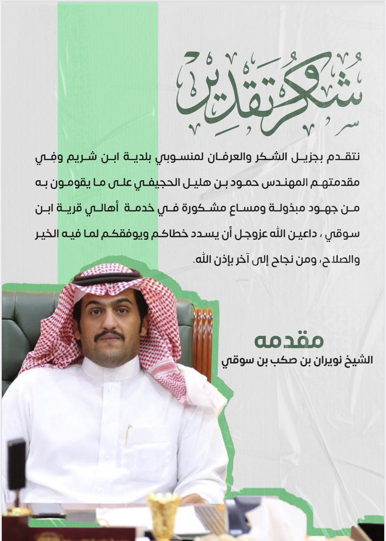 تشرف الشيخ نويران ابن سوقي بتكريم منسوبي بلدية ابن شريم يمثلهم المهندس حمود بن هليل الحجيفي ونائبه محمد بن فداع الشريم على مايقومون به من جهود مبذولة في الخدمات البلدية والمشاريع المقدمة لخدمة أهالي قرية ابن سوقي