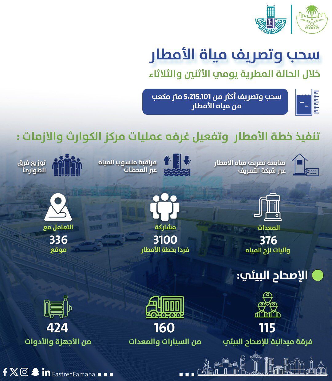 قامت أمانة المنطقة الشرقية بسحب وتصريف أكثر من ٥،٢١٥،١٠١ متر مكعب من مياه الأمطار التي شهدتها المنطقة الشرقية خلال اليومين الماضيين.