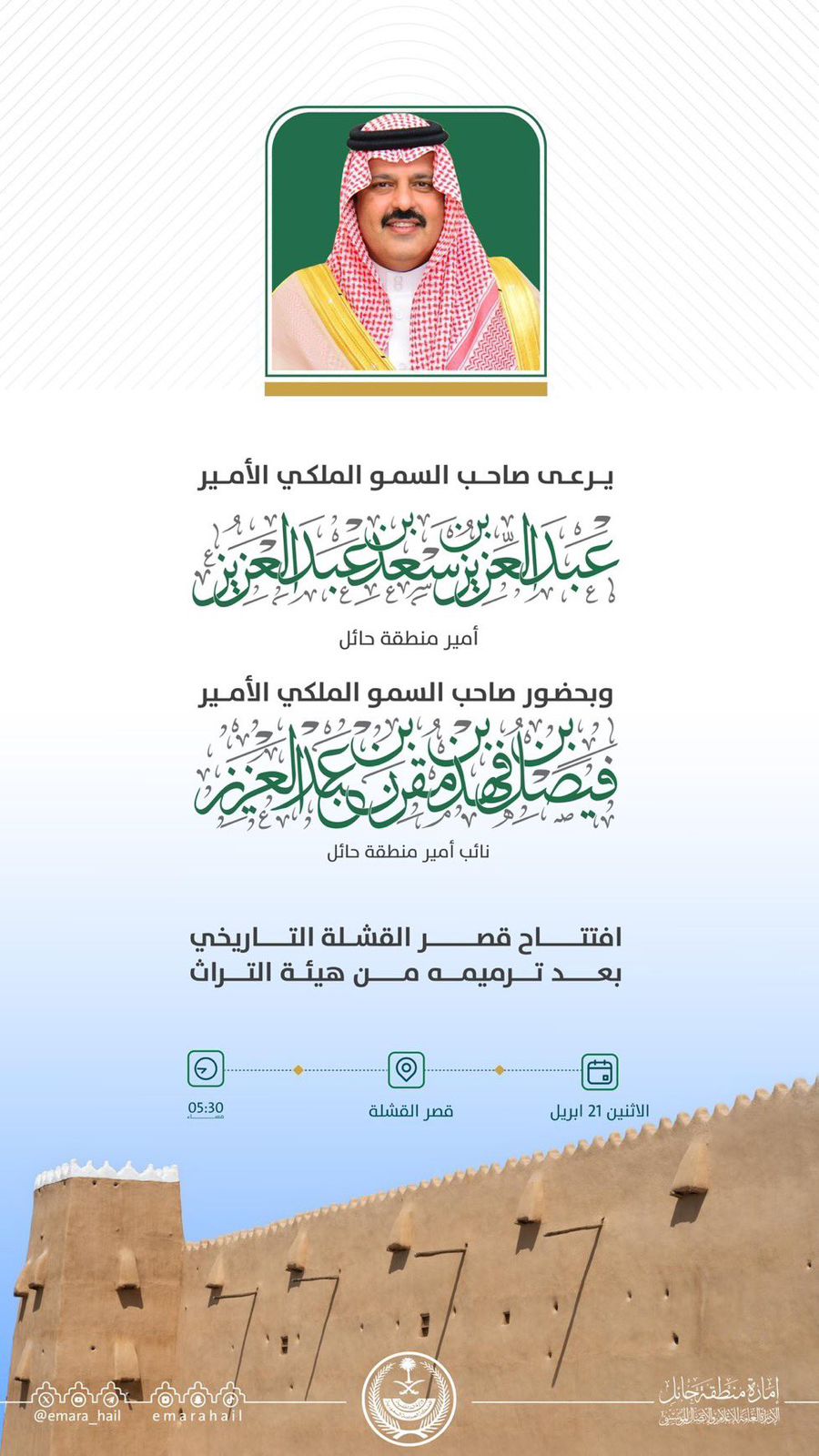 يرعى سمو أمير منطقة حائل اليوم الإثنين افتتاح قصر القشلة التاريخي بعد ترميمه من هيئة التراث، بحضور سمو نائب أمير منطقة حائل.