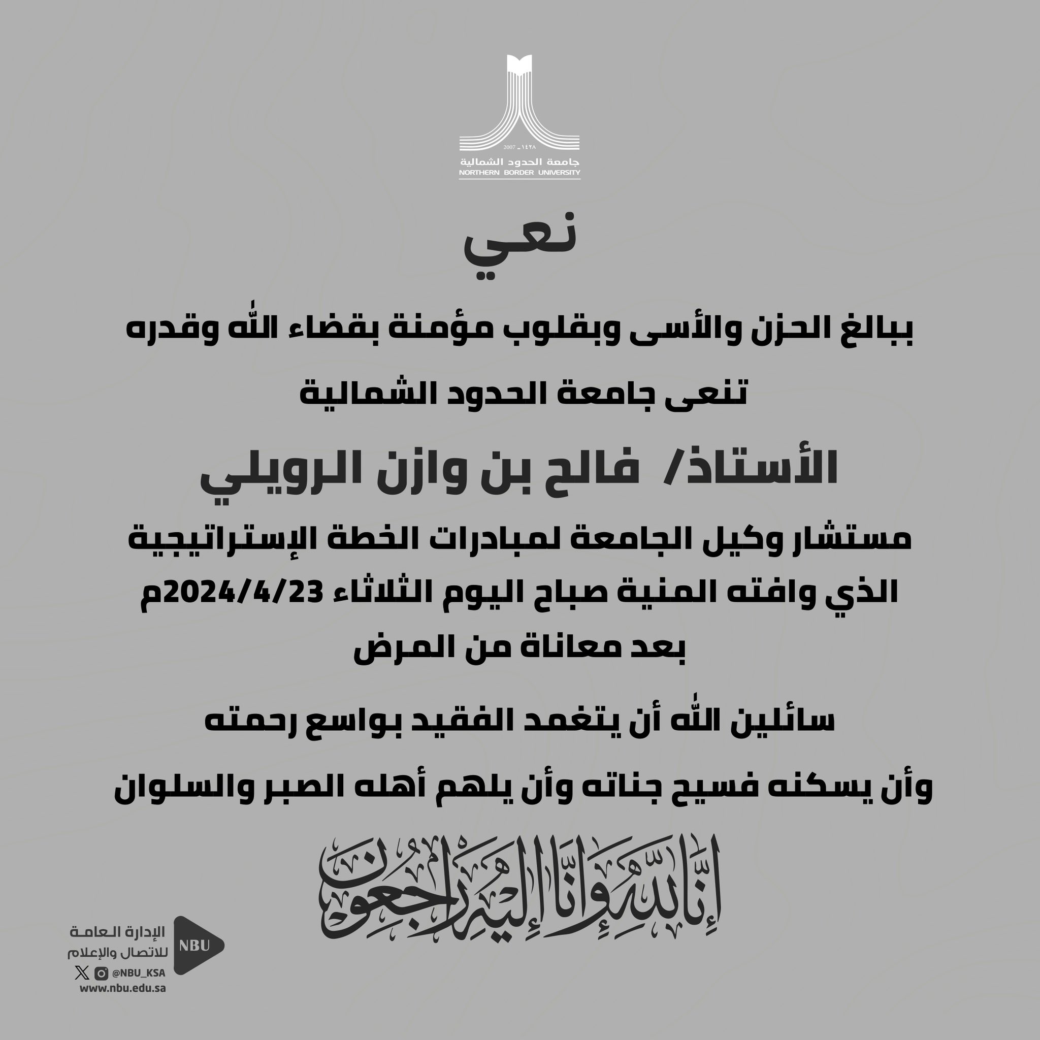تنعى جامعة الحدود الشمالية، الأستاذ/ فالح بن وازن الرويلي، مستشار وكيل الجامعة لمبادرات الخطة الإستراتيجية.