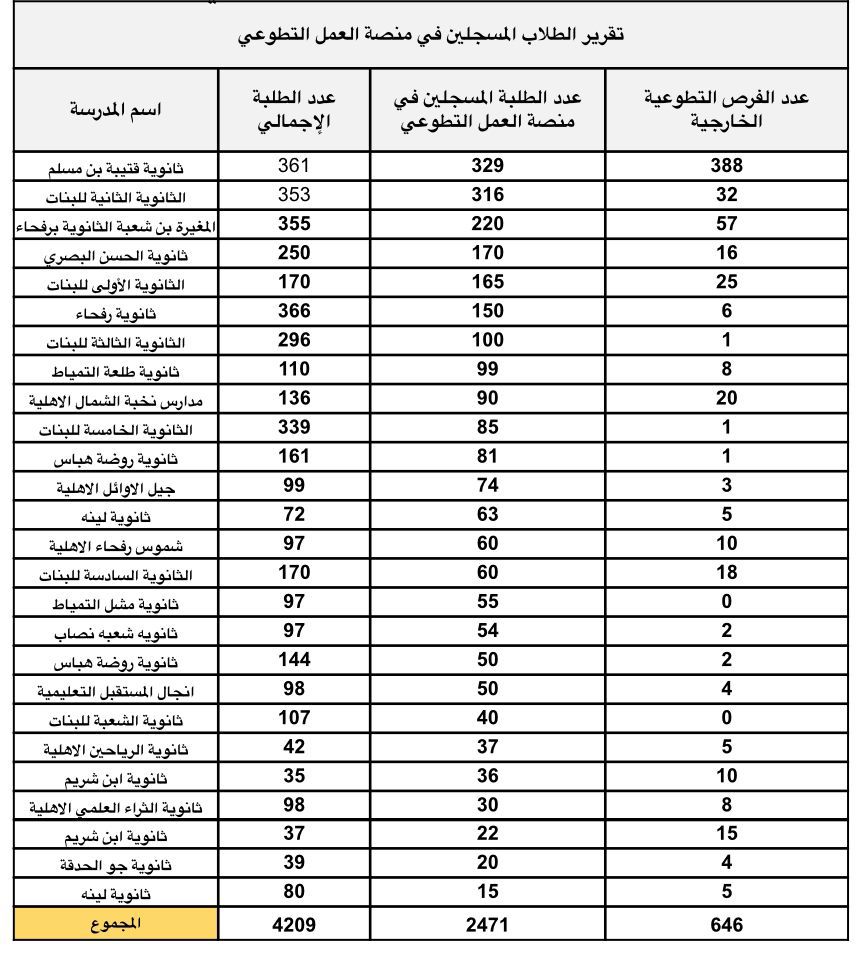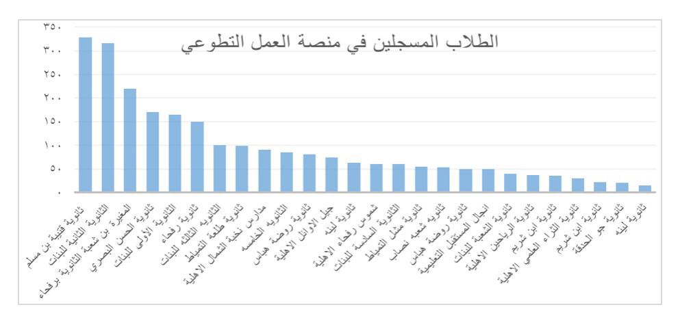 وتصدّرت ث قتيبة بن مسلم ترتيب المدارس في عدد المسجلين بالمنصة وبعدد الفرص التطوعية الخارجية تلتها ث الثانية للبنات ثم ث المغيرة بن شعبة ثم ث الحسن البصري.