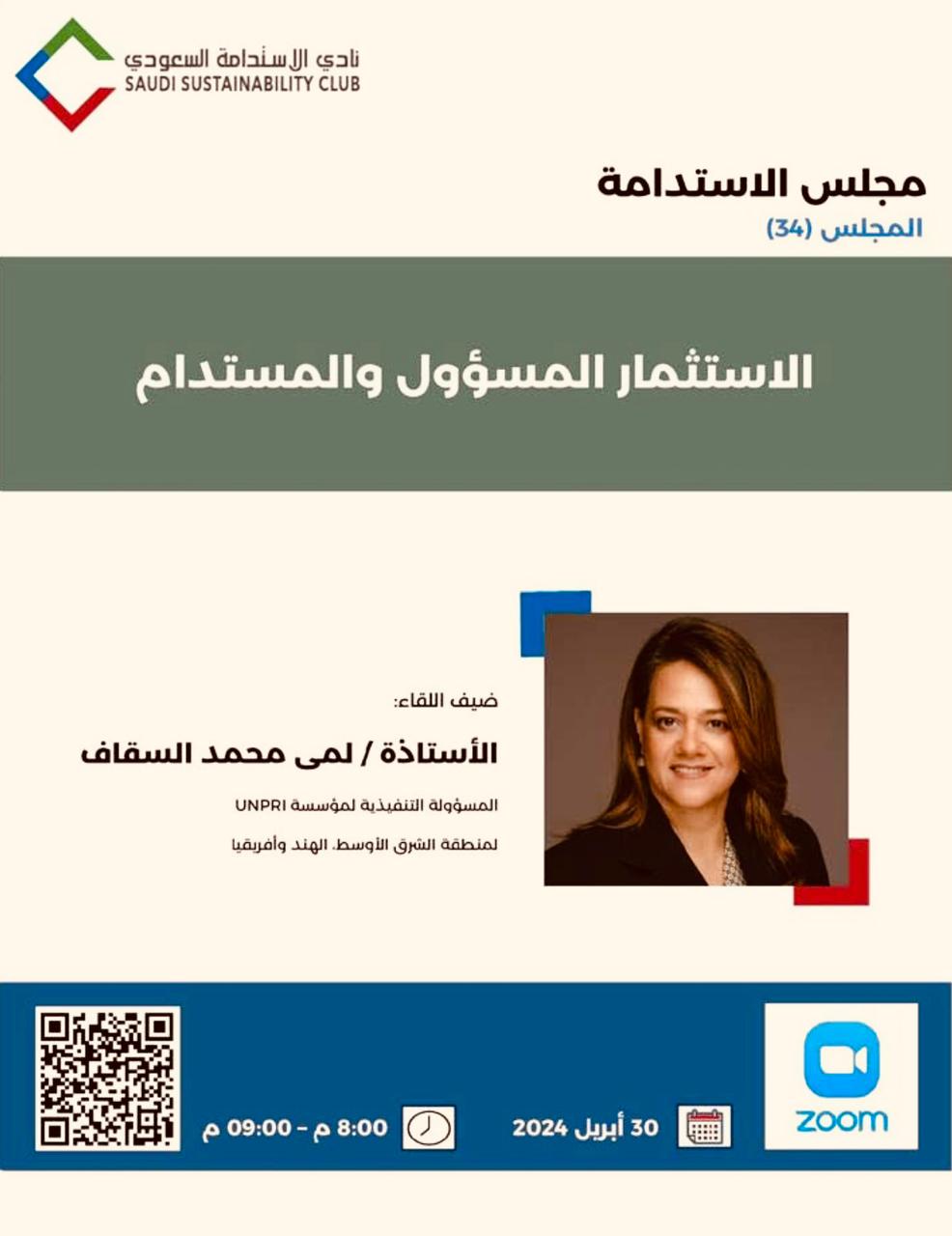 نادي الاستدامة السعودي يدعو المهتمين لحضور مجلس الاستدامة – الرابع والثلاثون، الثلاثاء 30 أبريل 2024 عند الثامنة مساءً وعبر منصة زووم. رابط التسجيل أدناه: