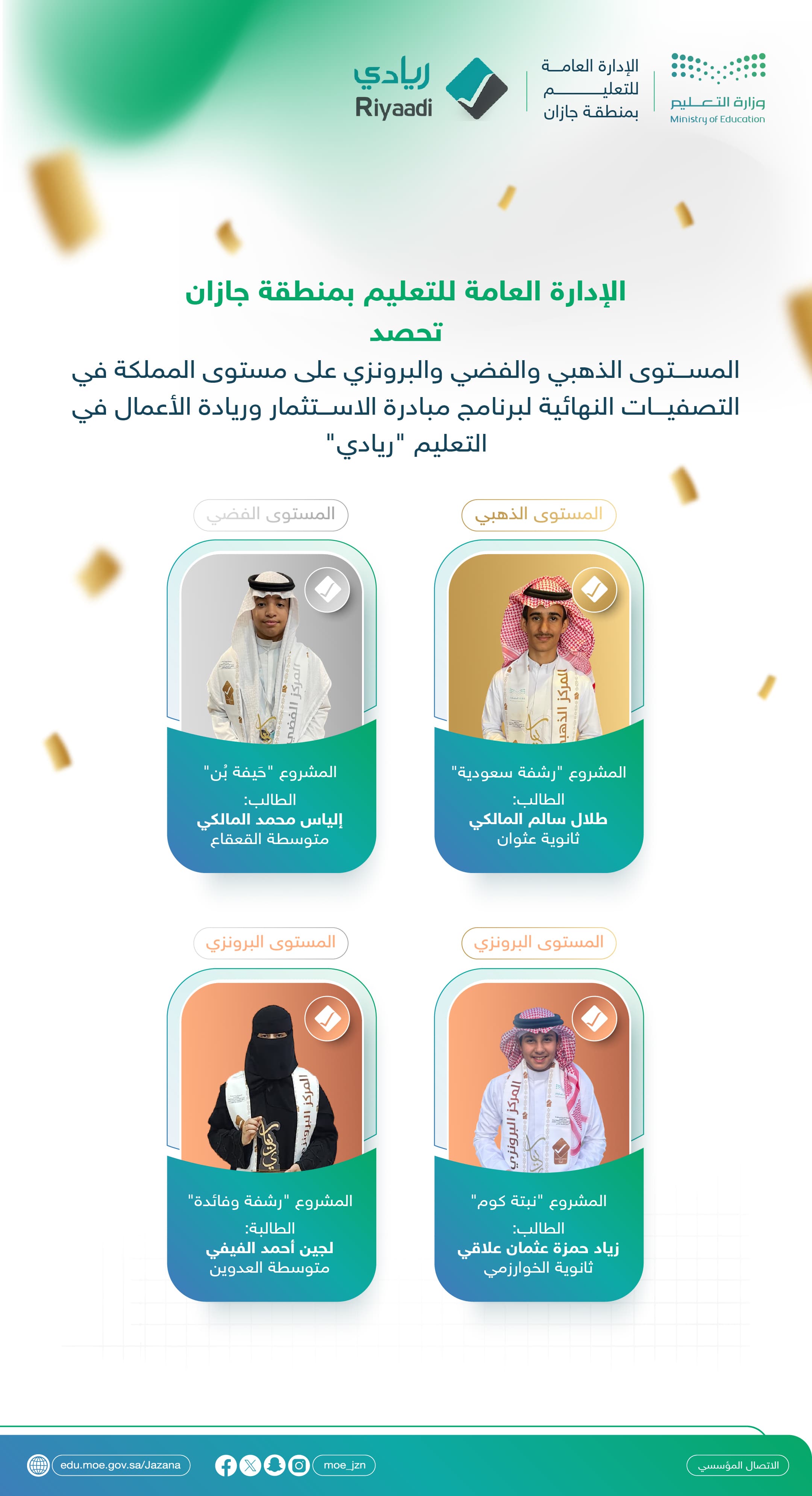 حصدت الإدارة العامة للتعليم بمنطقة جازان المستوى الذهبي والفضي والبرونزي على مستوى المملكة في التصفيات النهائية في برنامج "مبادرة الاستثمار وريادة الأعمال في التعليم "ريادي" الذي استضافته الإدارة العامة للتعليم بمنطقة الباحة.