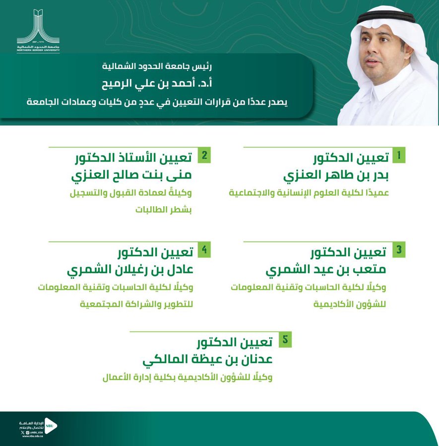 أصدر رئيس جامعة الحدود الشمالية أ.د.أحمد بن علي الرميح؛ عددًا من قرارات التعيين في عدد من كليات وعمادات الجامعة وجاءت كالتالي: