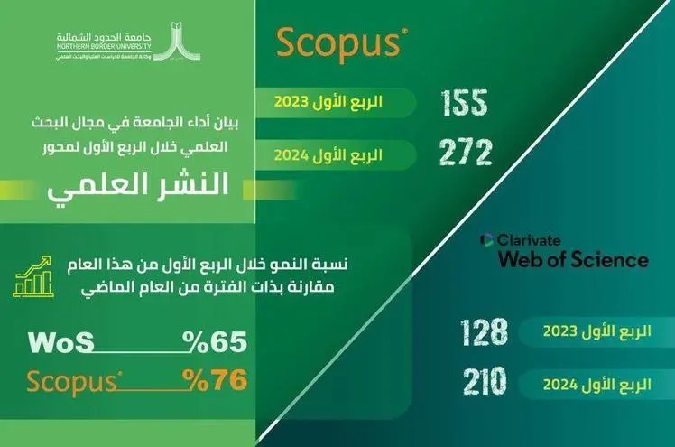 شهدت جامعة الحدود الشمالية تطوراً كبيراً في البحث العلمي بزيادة نسبتها 65% في عدد الأبحاث المنشورة ضمن شبكة العلوم، خلال الربع الأول من عام 2024 م، و 76% في سكوبس، وذلك مقارنة بالربع الأول من 2023، حيث تركزت الأبحاث في مجالات الطاقة المتجددة، والتكنولوجيا والهندسة، والكيمياء الحيوية، والبيولوجيا الجزيئية.