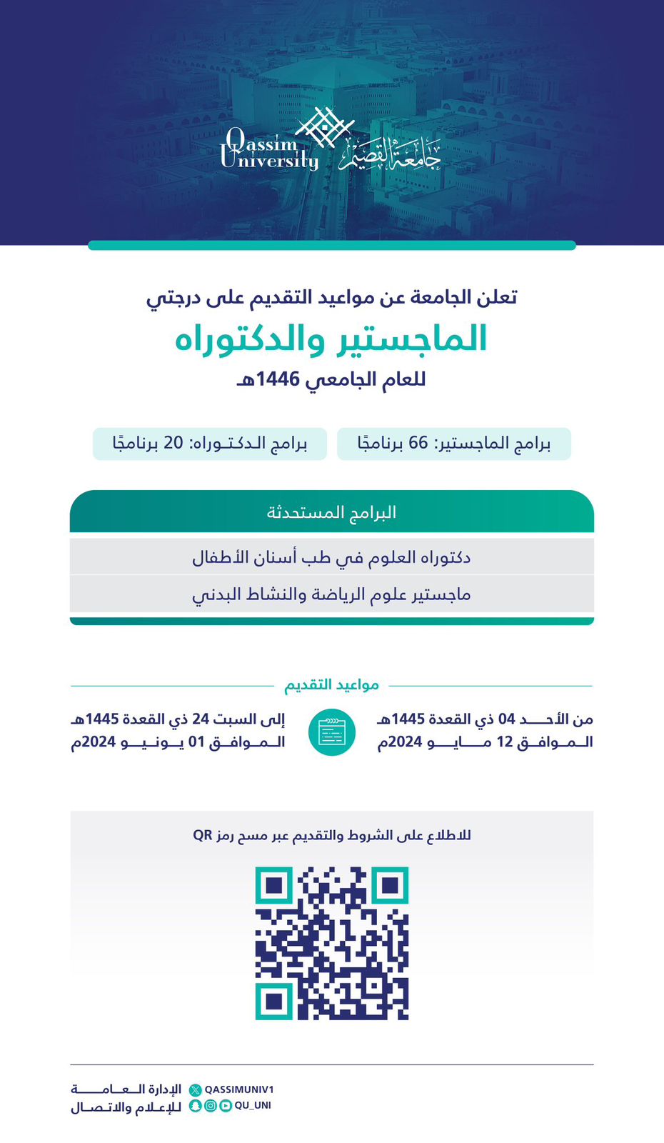 أعلنت جامعة القصيم، ممثلة بعمادة الدراسات العليا والبحث العلمي، عن موعد بدء التقديم على برامج الدراسات العليا "ماجستير ودكتوراه" للعام الجامعي المقبل 1446هـ، وذلك اعتبارًا من اليوم الأحد حتى تاريخ 1445/11/24هـ ،حيث تستقبل العمادة طلبات الراغبين في التقديم على هذه البرامج إلكترونيًا عبر البوابة الإلكترونية للجامعة.