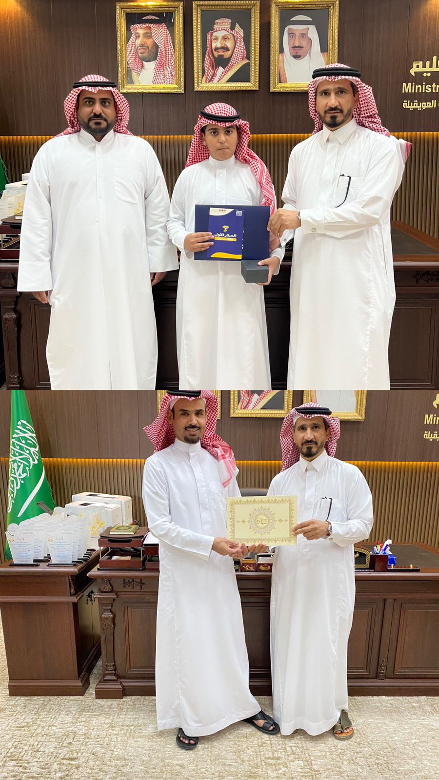 نيابة عن سعادة مدير عام تعليم الحدود الشمالية كرّم مدير مكتب تعليم العويقيلة الطالب : فراس بن سعد الشمري بمناسبة فوزه بمسابقة المهارات الثقافية (مسار المانجا) وتحقيقه المركز الأول ، وكرّم رائد النشاط الطلابي بمدرسة عبدالله بن رواحة الابتدائية الاستاذ خالد بن ماشي الشمري .