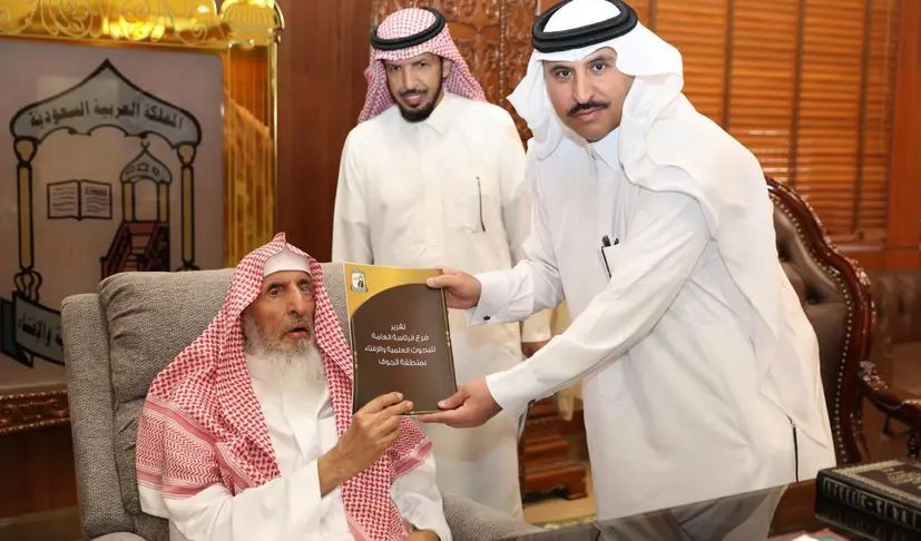 استقبل سماحة مفتي عام المملكة رئيس هيئة كبار العلماء والرئيس العام للبحوث العلمية والإفتاء الشيخ عبدالعزيز بن عبدالله بن محمد آل الشيخ في مكتب سماحته، مدير عام فرع الرئاسة العامة للبحوث العلمية والإفتاء بمنطقة الجوف مفرح الرويلي، الذي سلّم لسماحته التقرير الختامي للفرع لعام ٢٠٢٣.