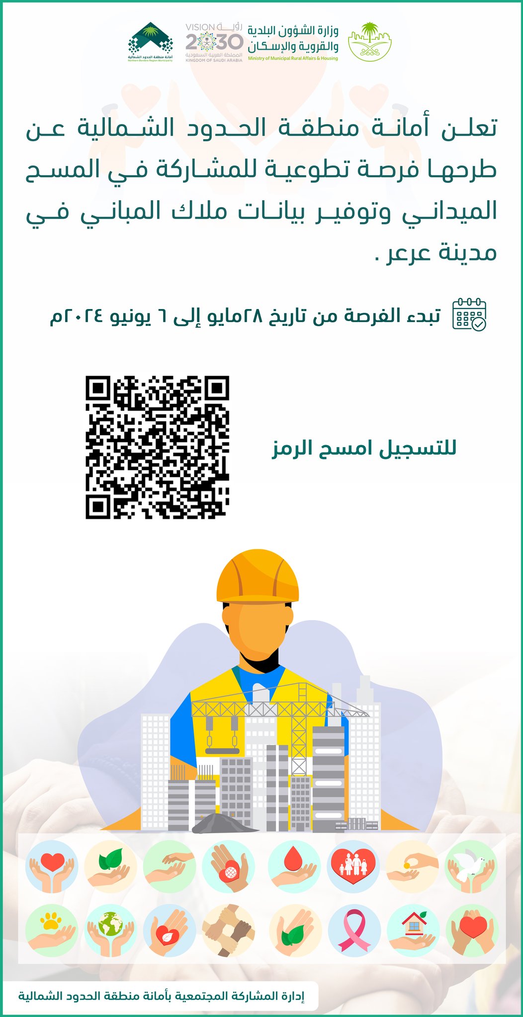 تعلن أمانة منطقة الحدود الشمالية عن طرحها فرصة تطوعية للمشاركة في المسح الميداني وتوفير بيانات ملاك المباني في مدينة عرعر .