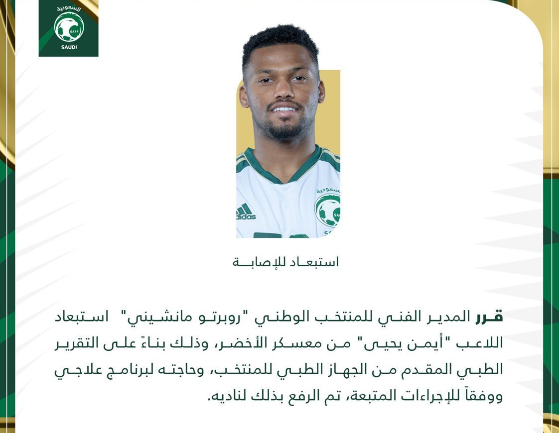 استبعد مدرب المنتخب السعودي الإيطالي روبرتو مانشيني أيمن يحيى من معسكر الأخضر بداعي الإصابة وحاجته إلى برنامج علاجي.