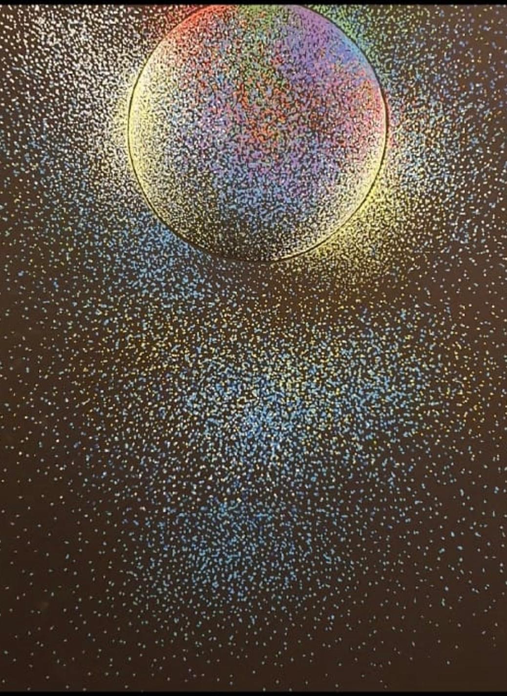 الاولى بإظهار النور والظل من خلال النقطة في لون واحد ثم تعددت النقاط والألوان .