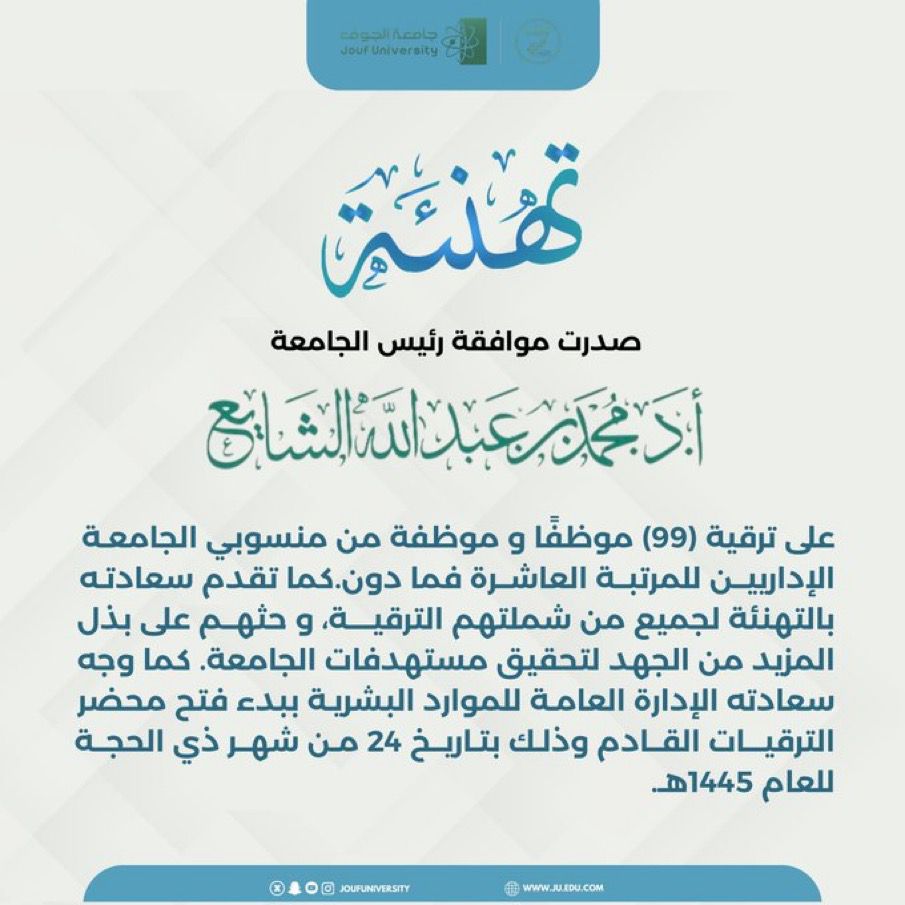 تقدم رئيس جامعة الجوف الاستاذ الدكتور محمد بن عبدالله الشايع بخالص التهنئة للموظفين والموظفات من منسوبي الجامعة من الإداريين الذين صدرت لهم قرارات الموافقة على ترقياتهم للمرتبة العاشرة فما دون والذي بلغ عددهم 99 موظفًا وموظفة