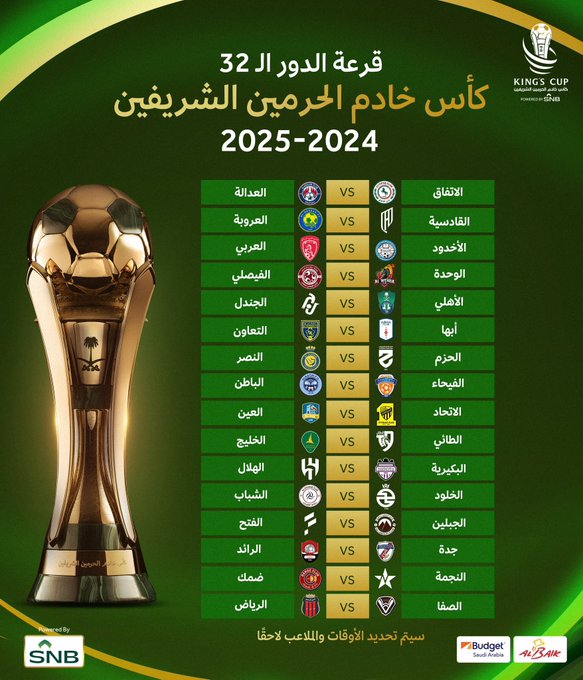 وأسفرت قرعة دور الـ32 من بطولة كأس الملك، عن وقوع الهلال حامل اللقب مع البكيرية، فيما يلتقي النصر وصيف النسخة الماضية مع نادي الحزم، أما الأهلي سيواجه الجندل بينما يلتقي الاتحاد مع العين.