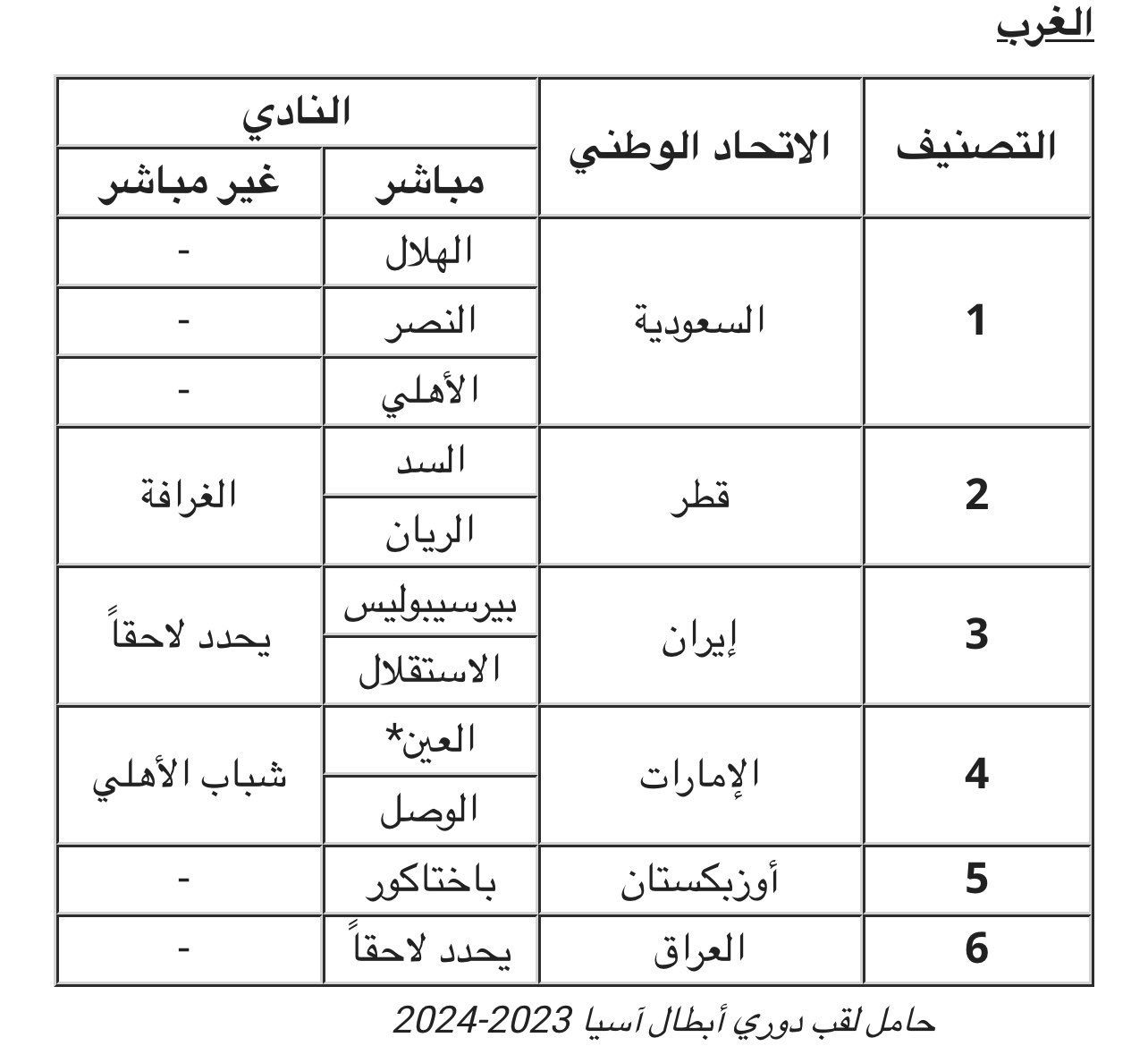 الاتحاد الآسيوي يعلن رسميًا الأندية المشاركة في دوري أبطال آسيا للنخبة 2024-2025 القرعة تقام يوم الجمعة 16 أغسطس مباريات الملحق تقام فترة 6-13 أغسطس وأن وقت مباريات الملحق: