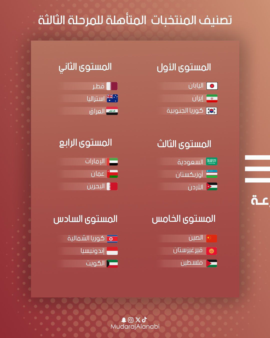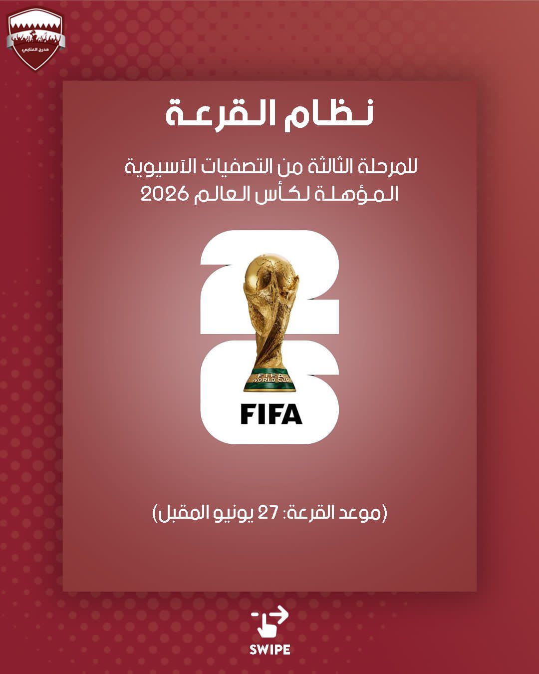 ستقام الخميس القادم 27 من الشهر الجاري في العاصمة الماليزية كوالالمبور قرعة التصفيات الآسيوية النهائية المؤهلة لكأس العالم 2026