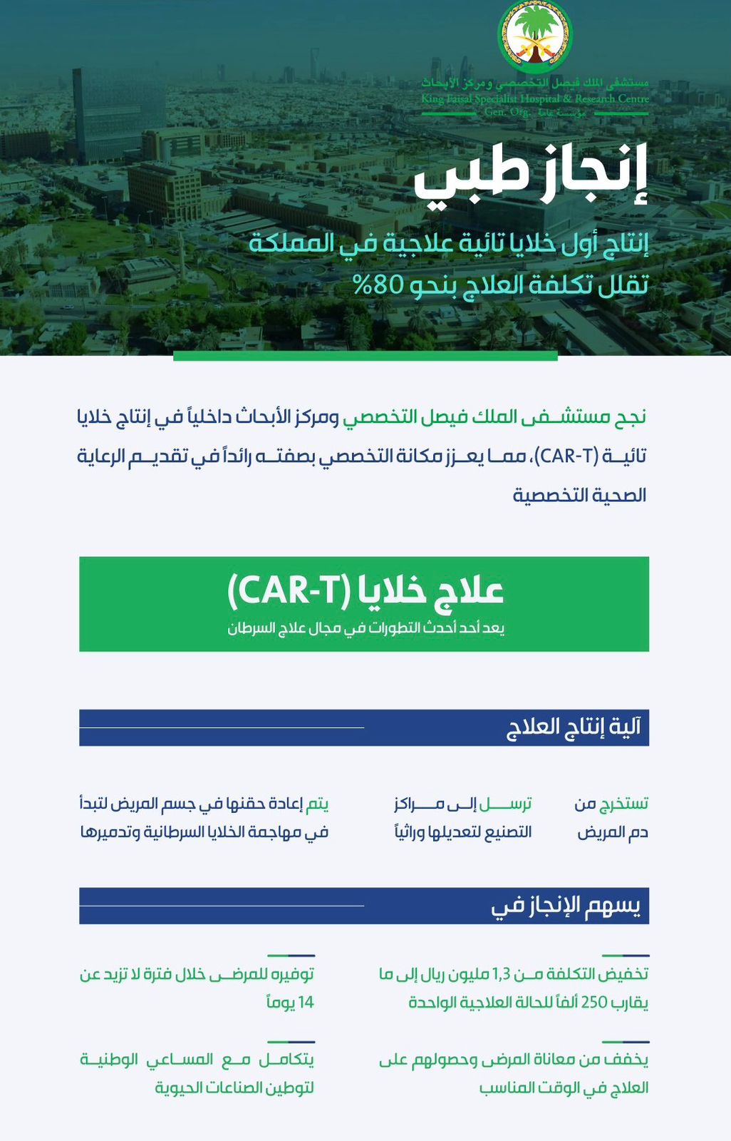 نجح مستشفى الملك فيصل التخصصي ومركز الأبحاث داخلياً في إنتاج خلايا تائية (CAR-T)، تستخدم في علاج مرضى السرطان، ما يسهم في تخفيض التكلفة من 1.3 مليون ريال إلى ما يقارب 250 ألف للحالة العلاجية الواحدة، وتوفيره للمرضى خلال فترة لا تزيد عن 14 يوماً، متجاوزاً بذلك كافة تحديات التكلفة والشحن، في إنجاز يخفف من معاناة المرضى وحصولهم على العلاج في الوقت المناسب، ويتكامل مع المساعي الوطنية لتوطين الصناعات الحيوية.