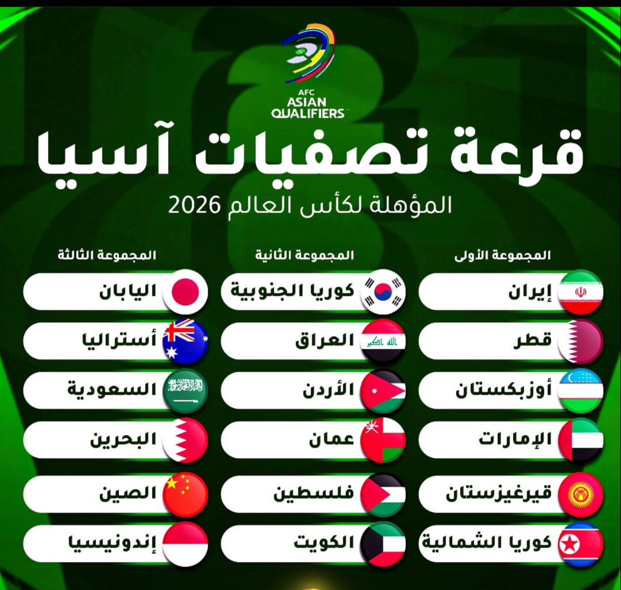 أقيمت هذا اليوم قرعة الدور النهائي من تصفيات آسيا لكأس العالم 2026 في العاصمة الماليزية كولالمبور وقد تأهل 18 منتخباً الى الدور النهائي من التصفيات على ان يتأهل 6 منتخبات بشكل مباشر للمشاركة في كأس العالم للمنتخبات 2026 وجاءت في المجموعة الثالثة مع اليابان - استراليا - البحرين - الصين - اندونيسيا بالتوفيق لصقورنا الخضر بقيادة المدرب الايطالي مانشيني
