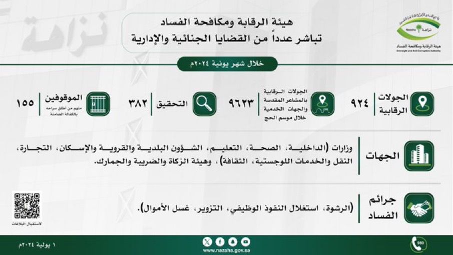 باشرت هيئة الرقابة ومكافحة الفساد عدداً من القضايا الجنائية والإدارية خلال شهر يونية 2024م