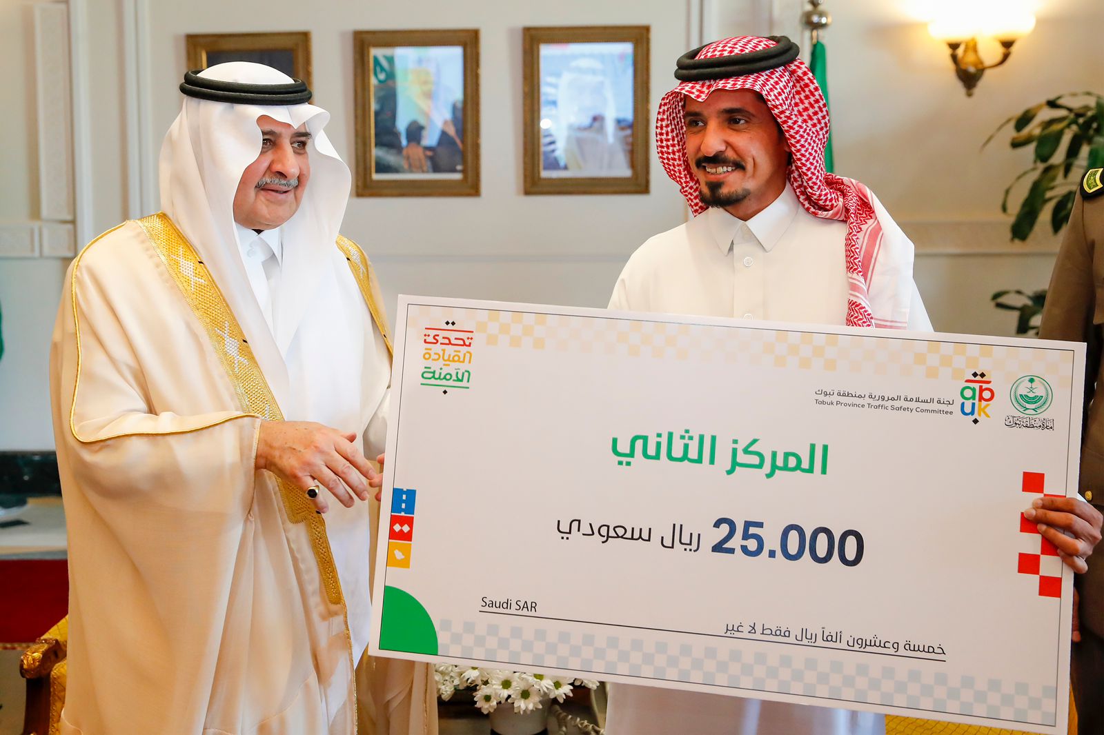 بعدها قام صاحب السمو الملكي الأمير فهد بن سلطان بن عبد العزيز أمير منطقة تبوك رئيس اللجنة العليا للسلامة المرورية بالمنطقة، بتكريم الفائزين بمسابقة تحدي القيادة الآمنة ، وشركاء مبادرة القيادة الآمنة من مختلف القطاعات الحكومية والأهلية الذين أسهموا في نجاح فعالياتها طوال فترة إقامتها، حيث بلغ مجموع ماتم رصده من جوائز مالية للجائزة " 500 " ألف ريال، تم توزيع مجملها على شكل مكافآت أسبوعية طوال الخمسة أشهر الماضية على السائقين الملتزمين بالأنظمة المرورية المحددة في إشتراطات الجائزة، فيما تم رصد 135 ألف ريال مكافاة مالية للعشرة الأوائل، إلى جانب ماسيتم سداده من مخالفات مرورية لعدد 10 فائزين بقيمة تصل الى 3 آلاف ريال لك فائز، وحصول 10 فائزين على خصومات لتأمين المركبات بنسبة تصل إلى 30%, إضافة إلى ماستقدمه شركة التعاونية من خصومات في مجال تأمين السيارات لأكثر من 1300 قائد مركبة.