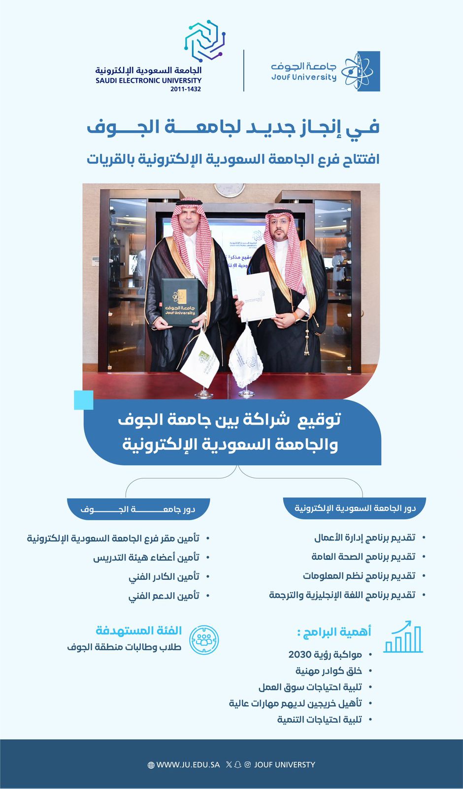 انطلاقًا من حرص جامعة الجوف على إتاحة فرص تعليمية متميزة لأبناء المنطقة، ورغبة منها في نقل المعرفة من خلال الشراكات الفاعلة مع المؤسسات التعليمية المختلفة داخل المملكة وخارجها، وقعت الجامعة مذكرة تفاهم مع الجامعة السعودية الإلكترونية؛ بهدف توفير مجموعة من البرامج في درجة البكالوريوس لأبناء وبنات محافظة القريات واستهدفت مجموعة من التخصصات التي تخدم سوق العمل، وتتوافق مع رؤية المملكة 2030.